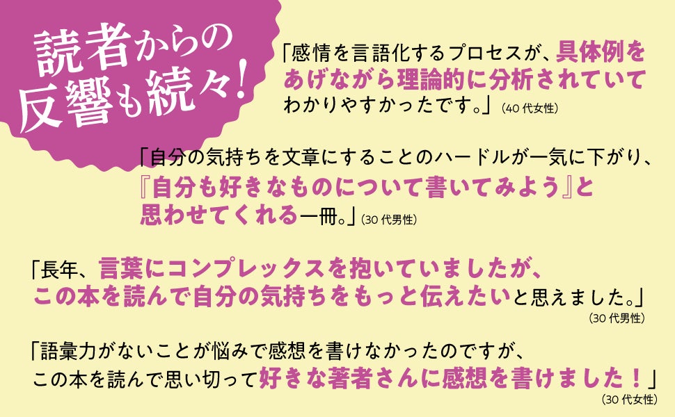 「語彙力がないことが悩みで感想を書けなかったのですが、この本を読んで思い切って好きな著者さんに感想を書けました!」(30代女性)