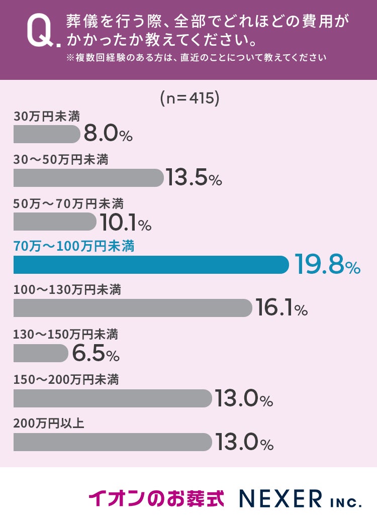 そこで今回は『イオンのお葬式』と共同で、事前調査で「喪主あるいは葬儀を執り行った経験がある」と回答した全国の男女415名を対象に「葬儀の費用」についてのアンケートをおこないました。