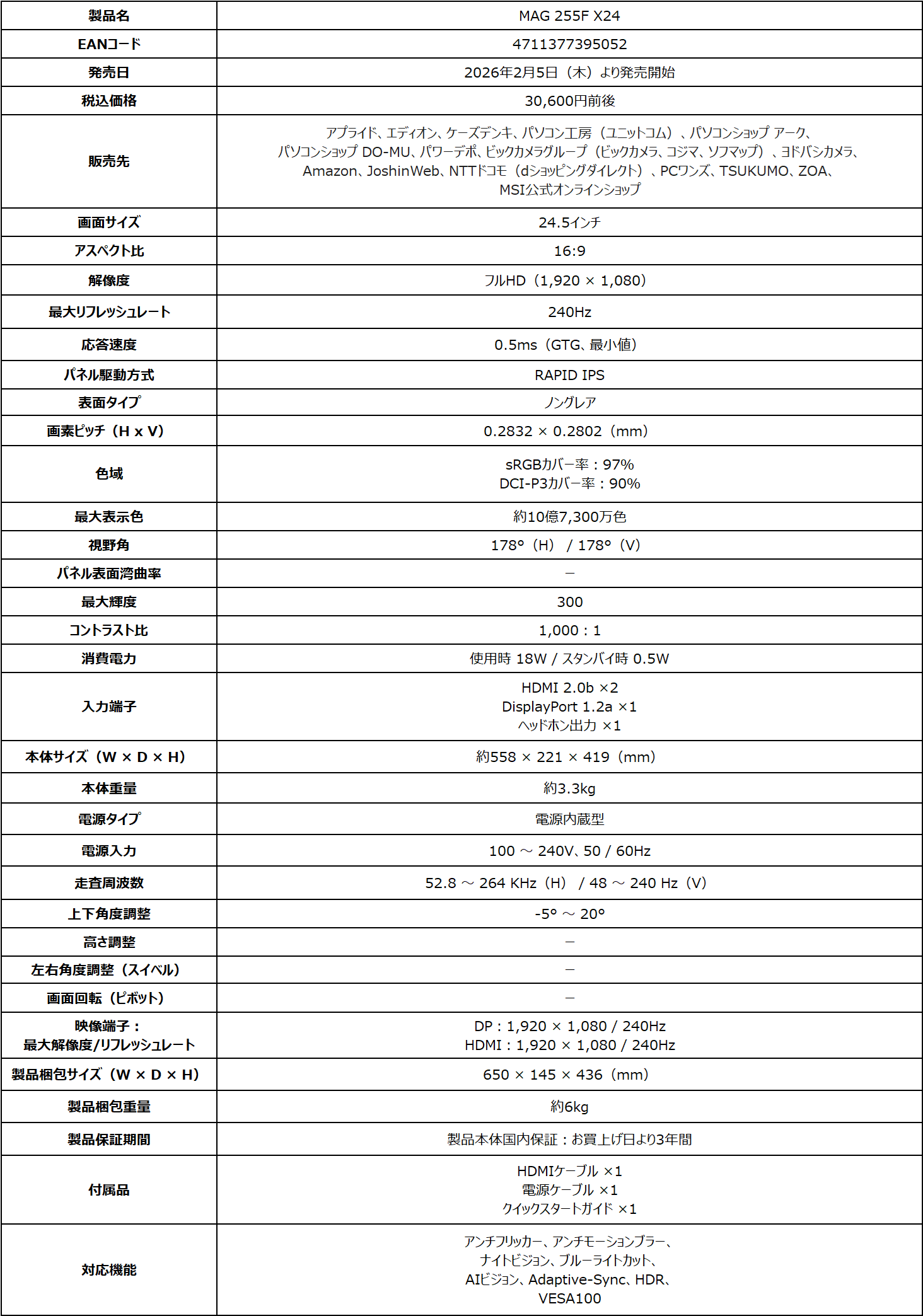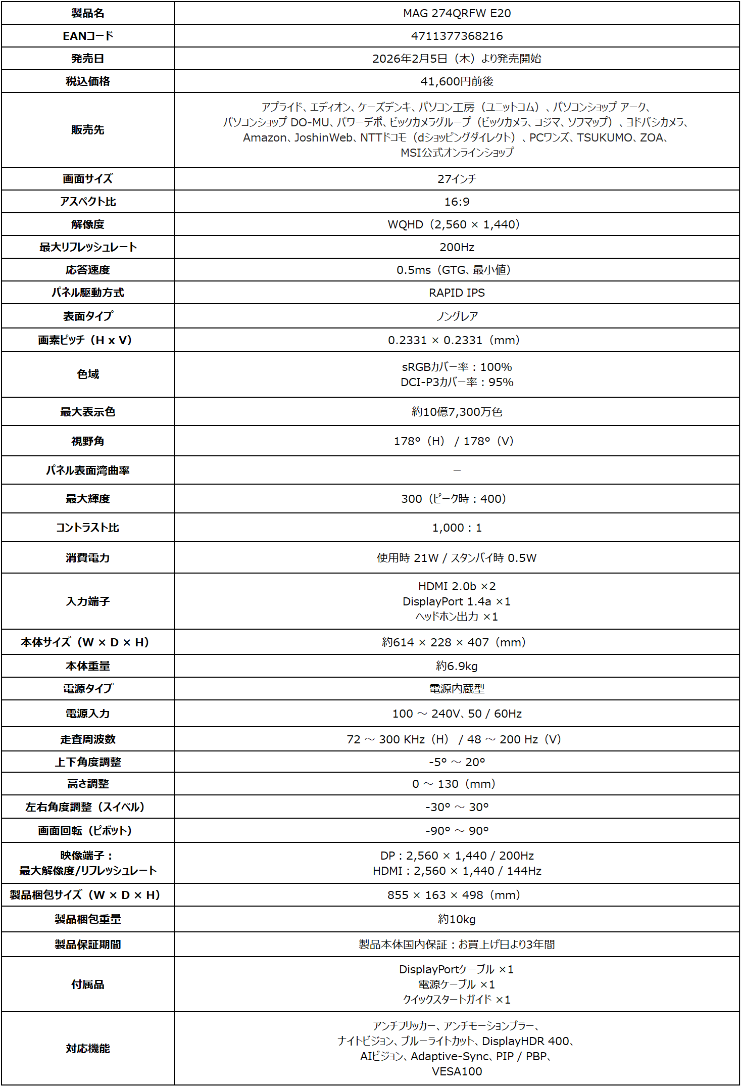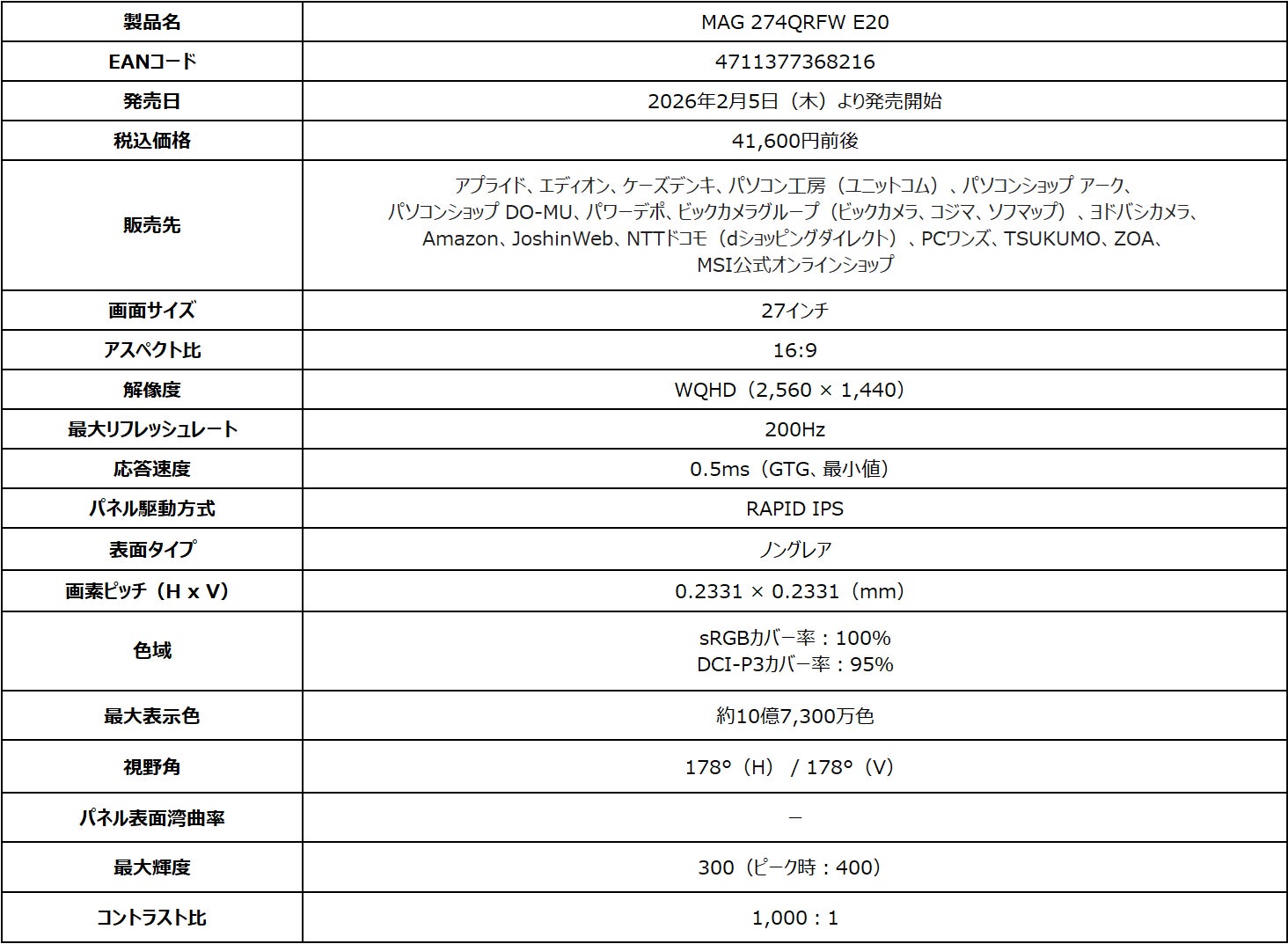 この度、エムエスアイコンピュータージャパン株式会社は2026年2月5日(木)より、ゲーミングモニターの新モデルを発売いたします。高いゲーミング性能とコストパフォーマンスに優れた『MAG』シリーズから、スタイリッシュなホワイト筐体を採用し、WQHD解像度のRAPID IPSパネル、リフレッシュレート200Hz、応答速度0.5ms(GTG、最小値)の高いスペックを備えた「MAG 274QRFW E20」、画面全体を把握しやすく競技系ゲームに適したサイズの24.5インチのフルHD解像度、リフレッシュレート240Hz、応答速度0.5ms(GTG、最小値)の「MAG 255F X24」の計2製品が新たにラインナップに加わります。