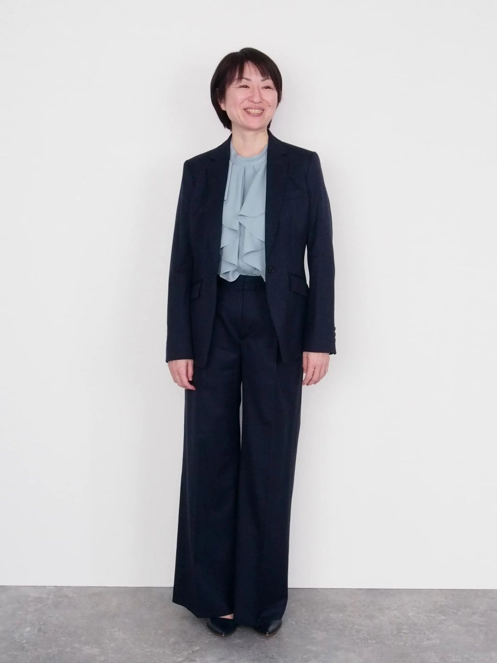 スタッフが仕立てたアイテムは、お仕事用のパンツスーツ。小柄なためワイドパンツには苦手意識があったとのことでしたが、身長や体型に合わせた補正を加えることで、シルエットの美しさを保ちつつ身体にフィットするオリジナルな1着が完成しました。