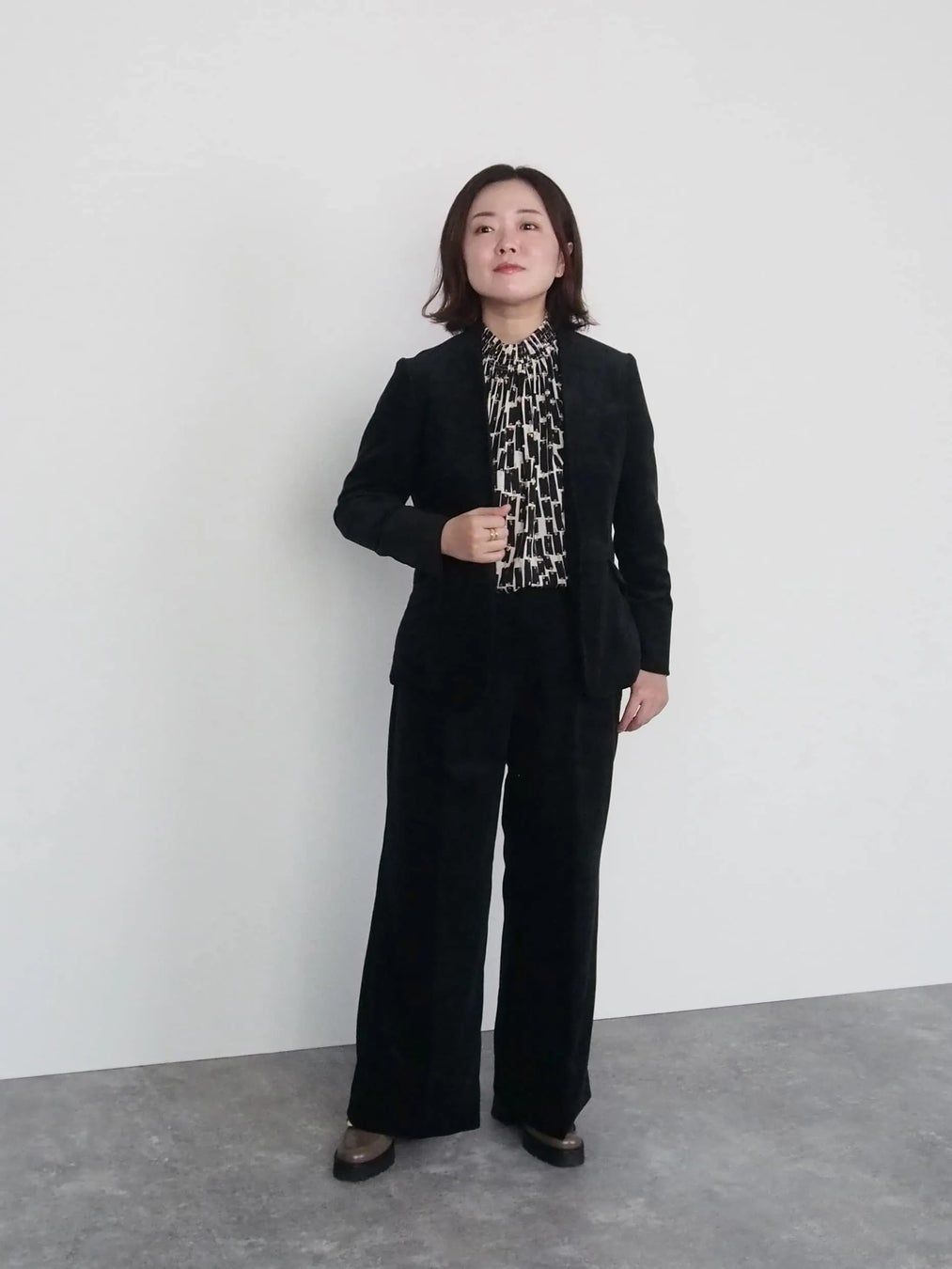着用してみると思ったよりも動きやすく、またジャケットの裏地が可愛いのでとても気に入っています。パンツのシルエットがきれいなので、ワイドパンツを選んで良かったと思います!