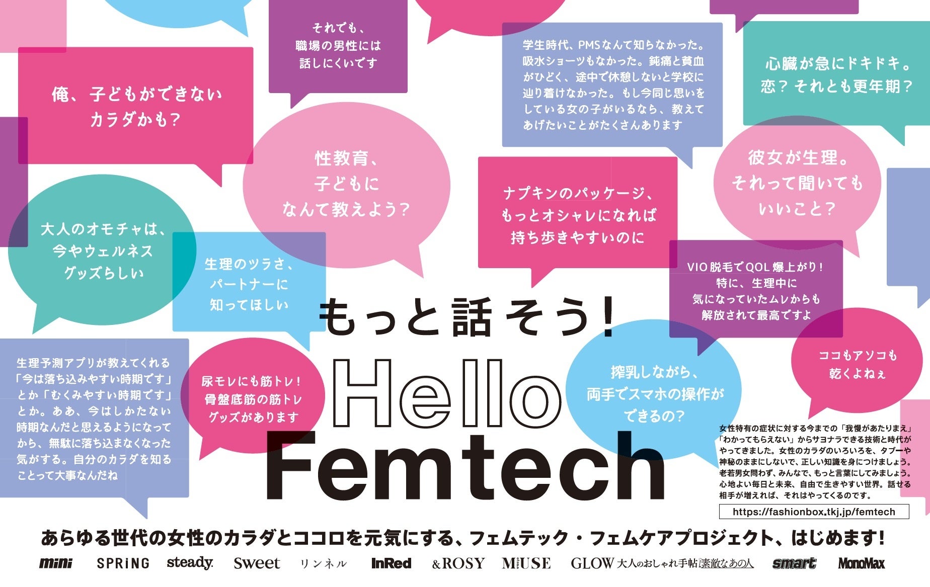 ファッション雑誌販売部数11年連続トップシェア(※)の株式会社宝島社(代表取締役社長:蓮見清一 本社:東京都千代田区)は、10~60代まで各世代の女性誌11誌・男性誌2誌の計13誌合同によるフェムテック・フェムケア啓発プロジェクト「もっと話そう! Hello Femtech(ハローフェムテック)」を2021年12月25日(土)より始動します。