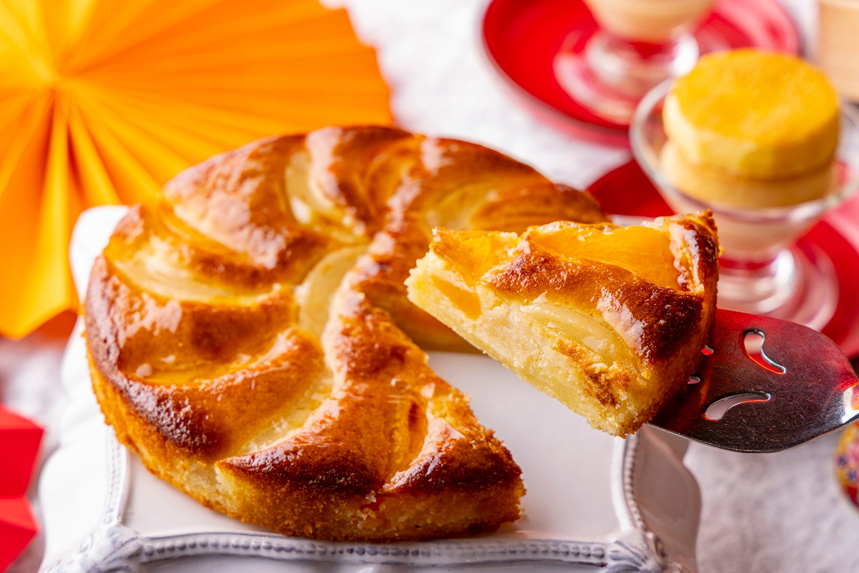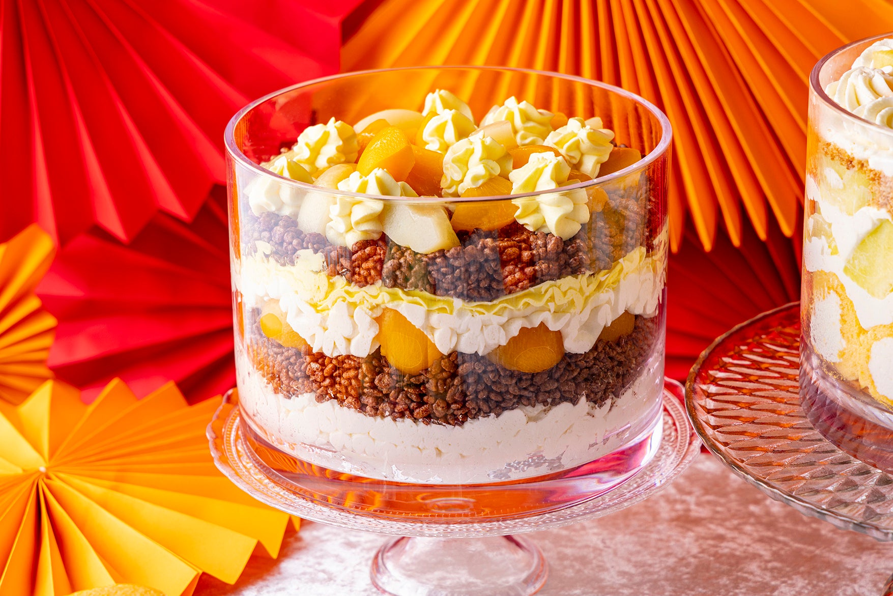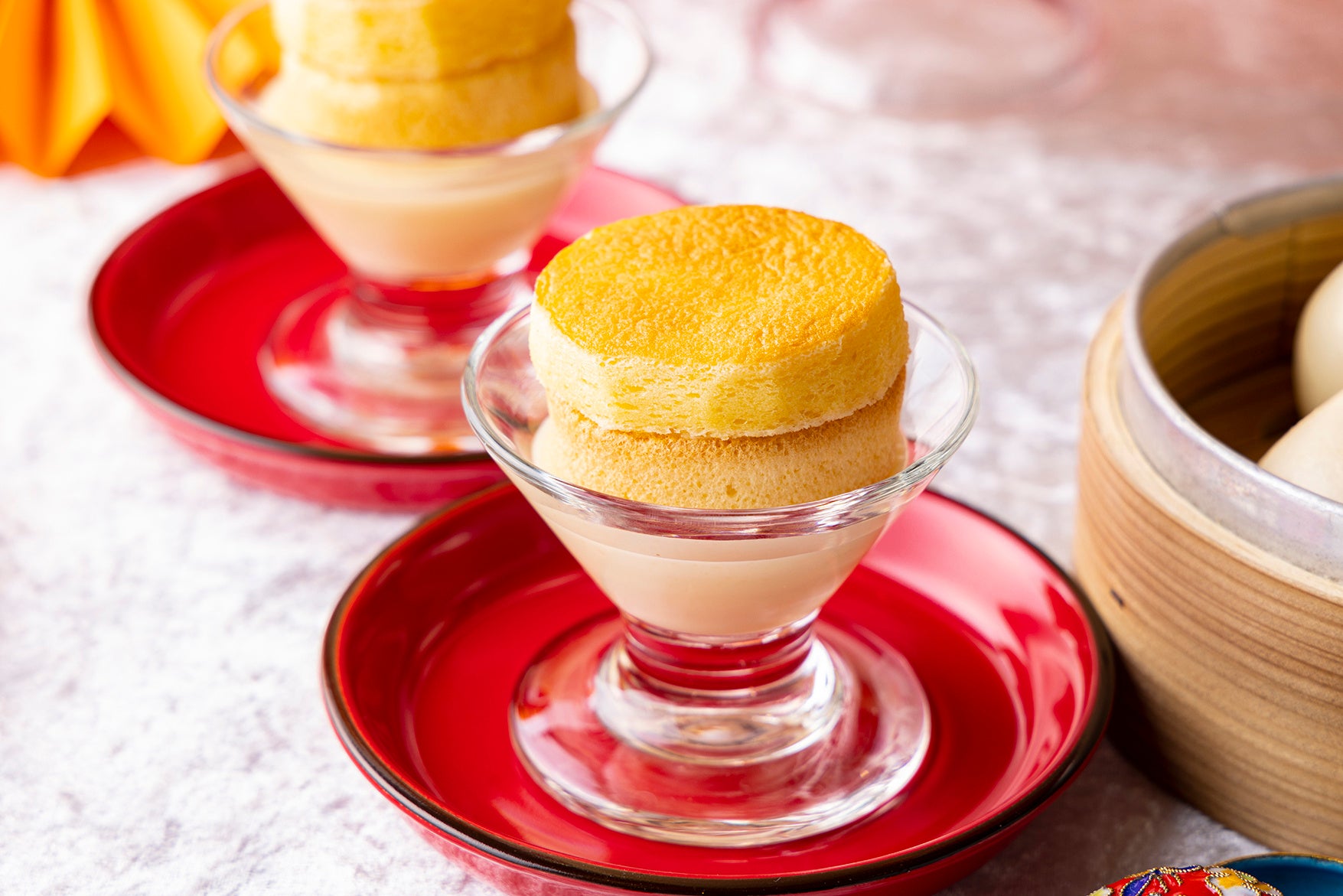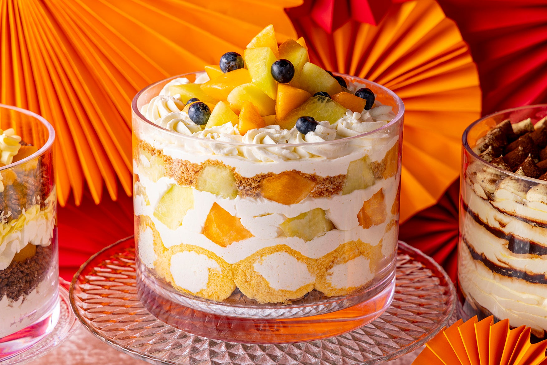 ピーチトライフル、メロントライフル、赤肉メロンのレアチーズケーキ、白桃と黄桃のタルト、メロンとココナッツのケーキ、桃饅頭、カステラ&プリン、杏仁豆腐、ティラミス、リコッタチーズのスフレパンケーキ フレッシュピーチ添えほか