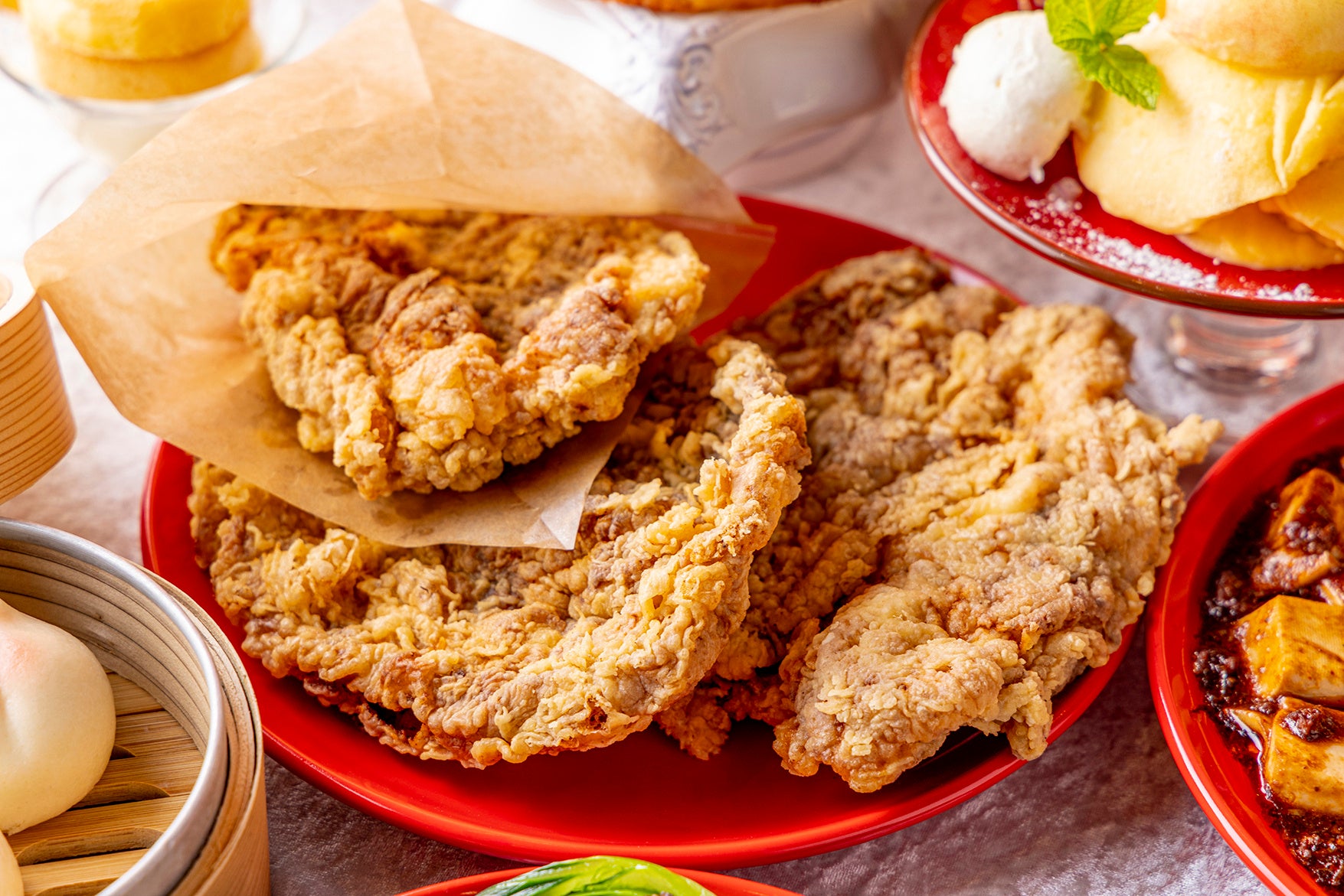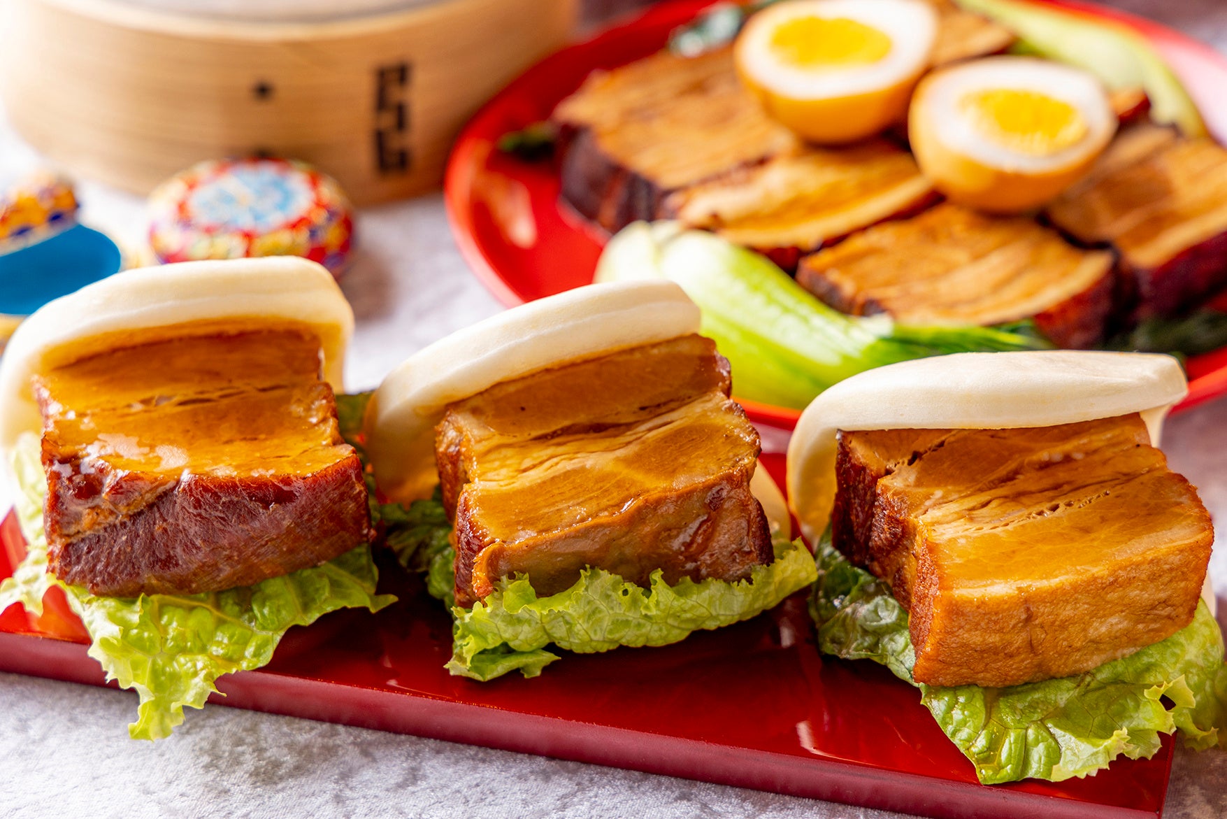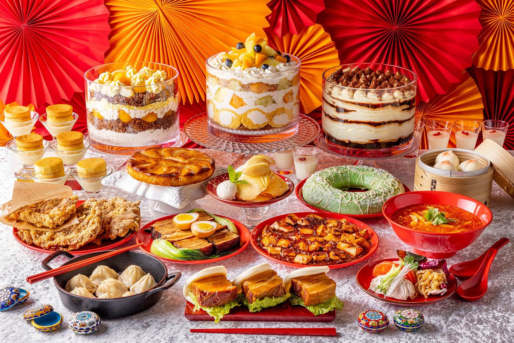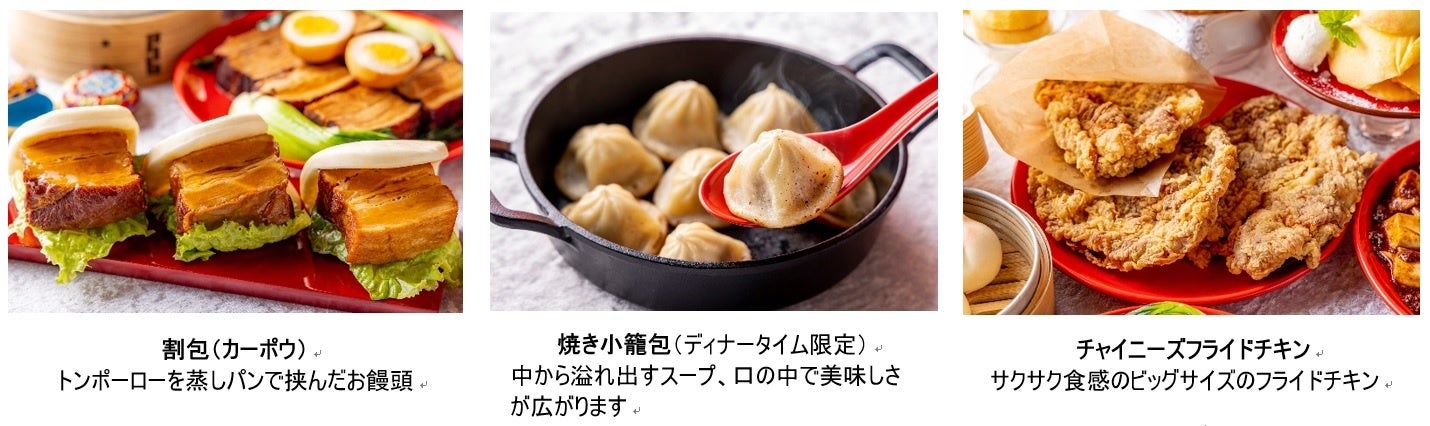 「チャイニーズ&ピーチ・メロンスイーツフェア」には、よだれ鶏、中華クラゲの和え物、ピータン豆腐などの前菜にはじまり、海老と白身魚のチリソース、四川麻婆豆腐、酸味が効いたスーラータンといった中華料理の定番メニューに加え、サクサク感とスパイシーな香り、手のひらサイズの大きなチャイニーズフライドチキン、うまみが凝縮された肉あんを厚めの皮で包んで香ばしく焼き上げた焼き小籠包、柔らかく煮込んだ豚の角煮(トンポーロー)を蒸しパンで挟んだ割包(カーポウ)など、チャイニーズフードがビュッフェに登場いたします。