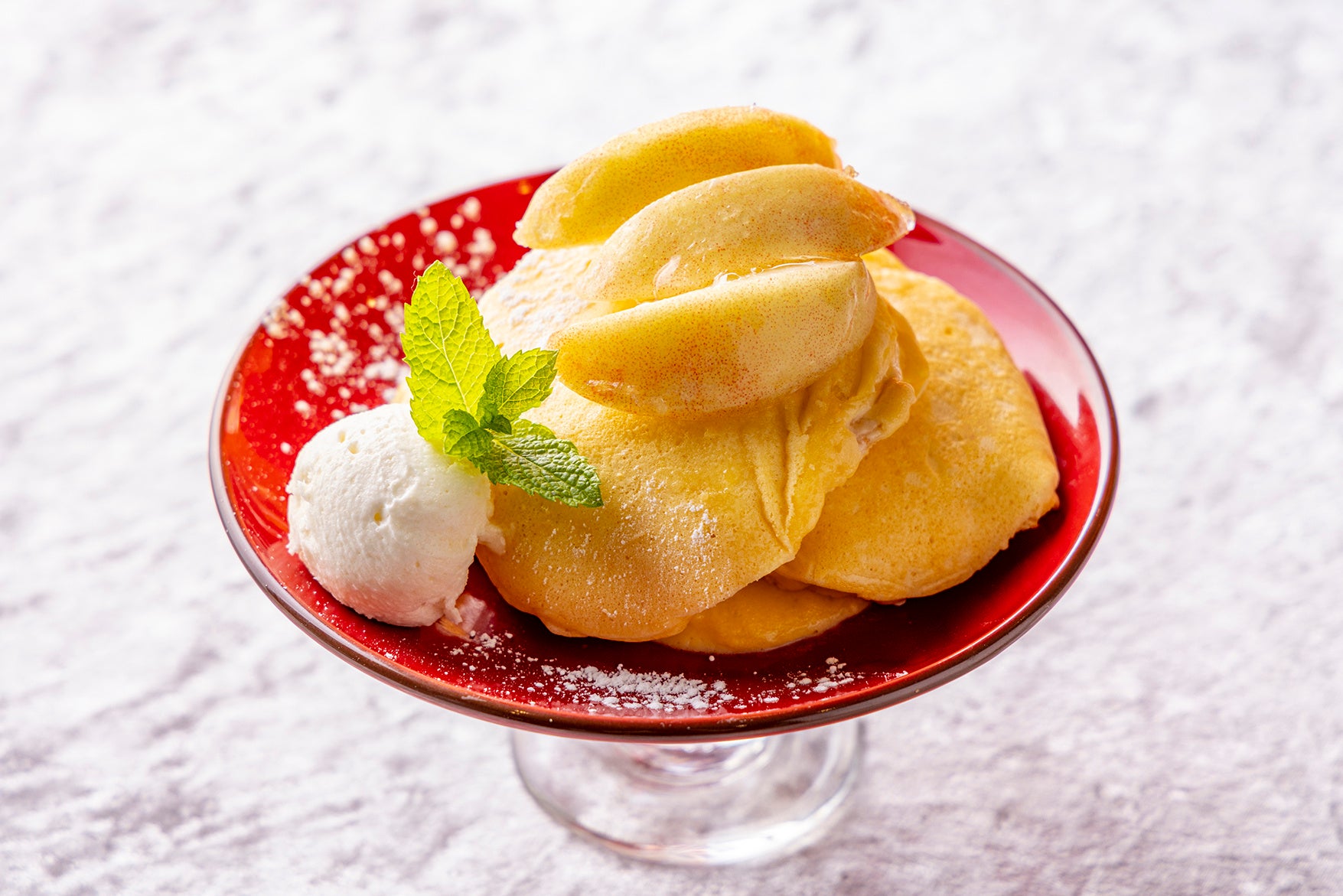 デザートには夏の人気フルーツ、桃とメロンの果肉を存分に感じられるスイーツを15種類ご用意しました。ロールケーキの上にホイップクリームと一緒にトッピングした赤肉メロンと青肉メロンが食べ比べできる大きなパフェのようなメロントライフル。白桃と黄桃のタルトや赤肉メロンのチーズケーキ。プリンの上に口溶けの良いカステラを乗せたカステラ&プリンは一度に2つの異なる食感が楽しめます。さらに、ランチタイムの“シェフのライブパフォーマンス”には、焼きたての「リコッタチーズのスフレパンケーキ」をご提供。軽くてフワフワな食感のスフレタイプのパンケーキは仕上げにフレッシュピーチとアイスクリームをトッピングした贅沢感たっぷりのスイーツです。