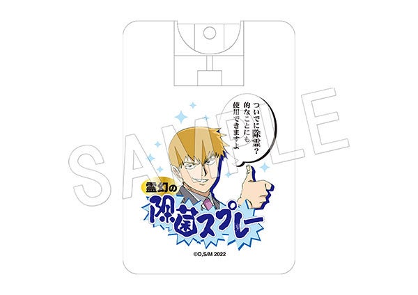 第1話の霊幻新隆の印象的なキメ顔を前面にデザインしたカード型のスプレーです。