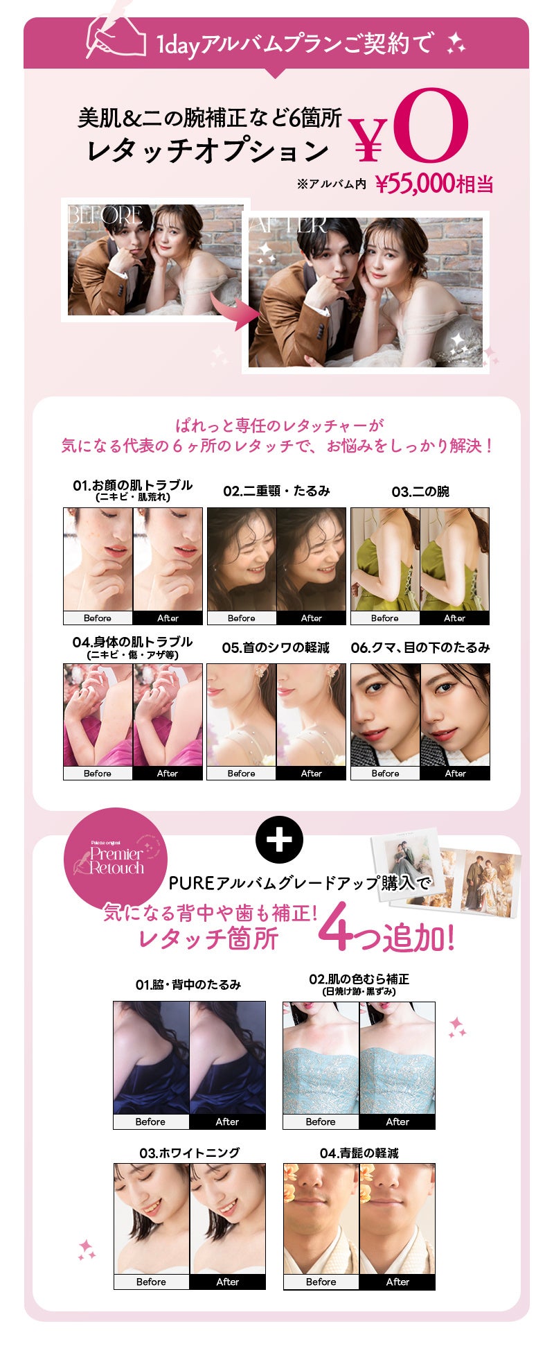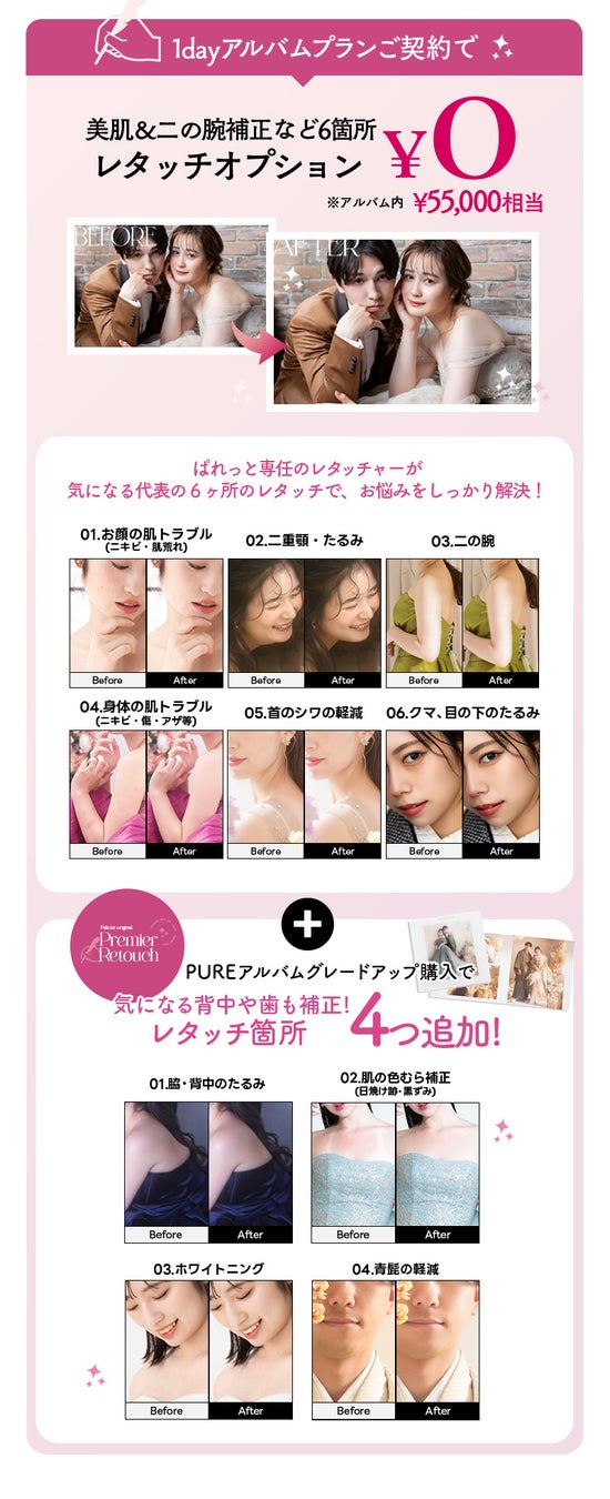 さらに、PUREアルバムをグレードアップ購入で、こだわりのレタッチが叶うプレミアレタッチがついてくる!プレミアレタッチ4箇所が追加され、合計10箇所のレタッチを施させていただきます。