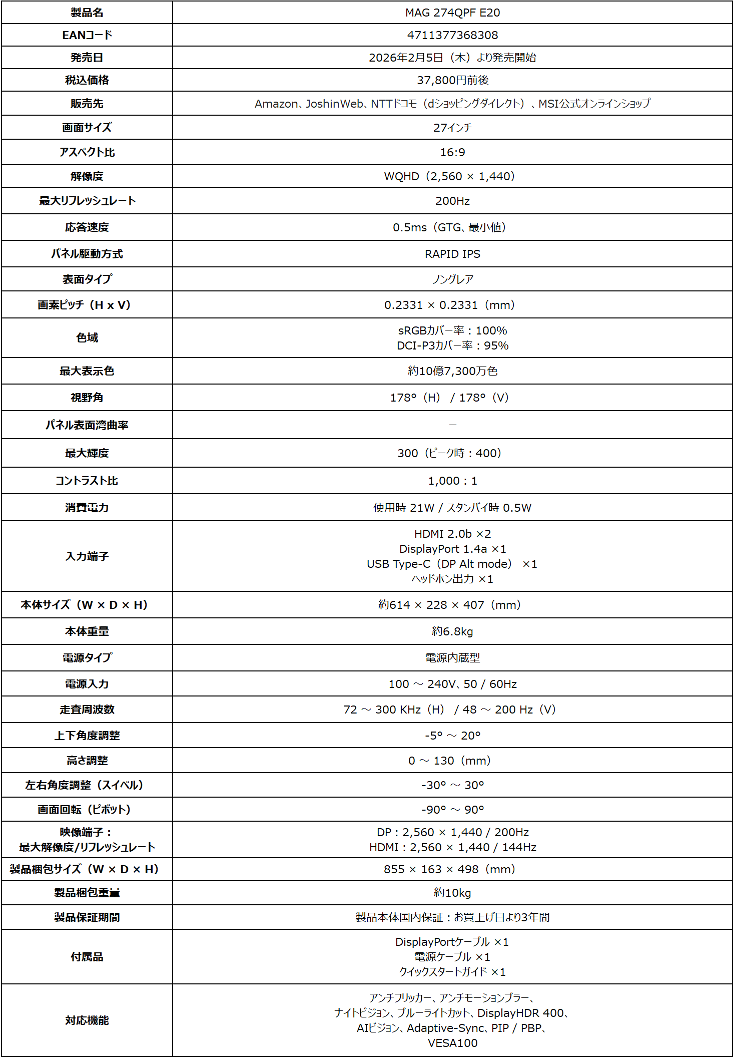 この度、エムエスアイコンピュータージャパン株式会社は2026年2月5日(木)より、ゲーミングモニターの新モデルを発売いたします。高いゲーミング性能とコストパフォーマンスに優れた『MAG』シリーズから、高精細なWQHD解像度のRAPID IPSパネル、リフレッシュレート200Hz・応答速度0.5ms(GTG、最小値)の高いゲーミングスペック、よりリアルな映像表現が可能なDisplayHDR 400に対応した「MAG 274QPF E20」が新たにラインナップに加わります。