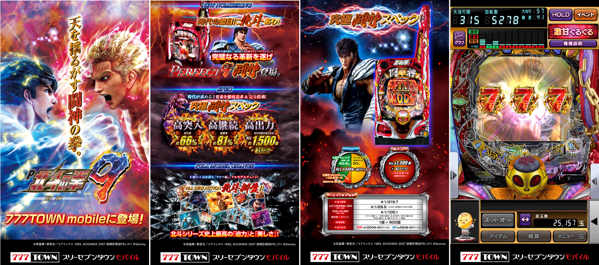 株式会社サミーネットワークスが運営するスマートフォン向けぱちんこ・パチスロゲーム「777TOWN mobile」(スリーセブンタウンモバイル)は2022年2月22日(火)より、サミー株式会社の「P北斗の拳9 闘神」アプリを配信いたします。
