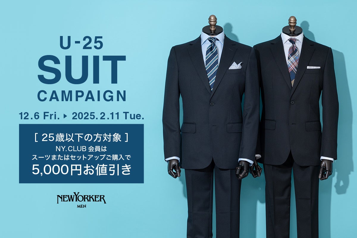 全国のニューヨーカーメンズショップでは、学生や次世代を担う若年の方々を対象に2024年12月6日(金)~2025年2月11日(火・祝)の期間『U-25 SUIT CAMPAIGN』を開催いたします。働き方の多様化に寄り添ったNEWYORKERらしい新鮮なビジネススタイルをご提案いたします。25歳以下の『NY.CLUB』会員、または新規ご入会いただいた25歳以下の方で、スーツまたはセットアップスーツをご購入いただくと5,000円お値引きいたします。ぜひ、この機会にご来店くださいませ。