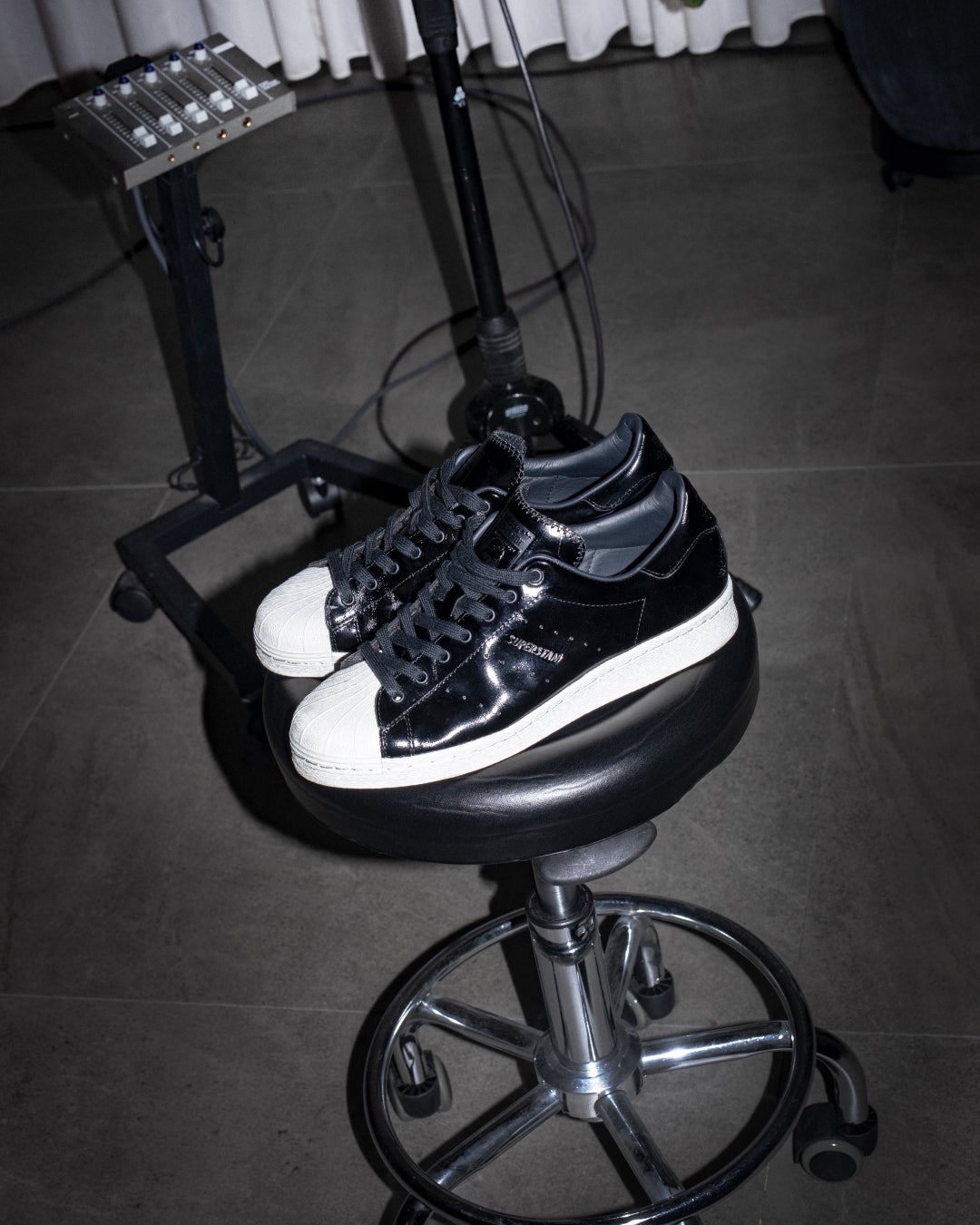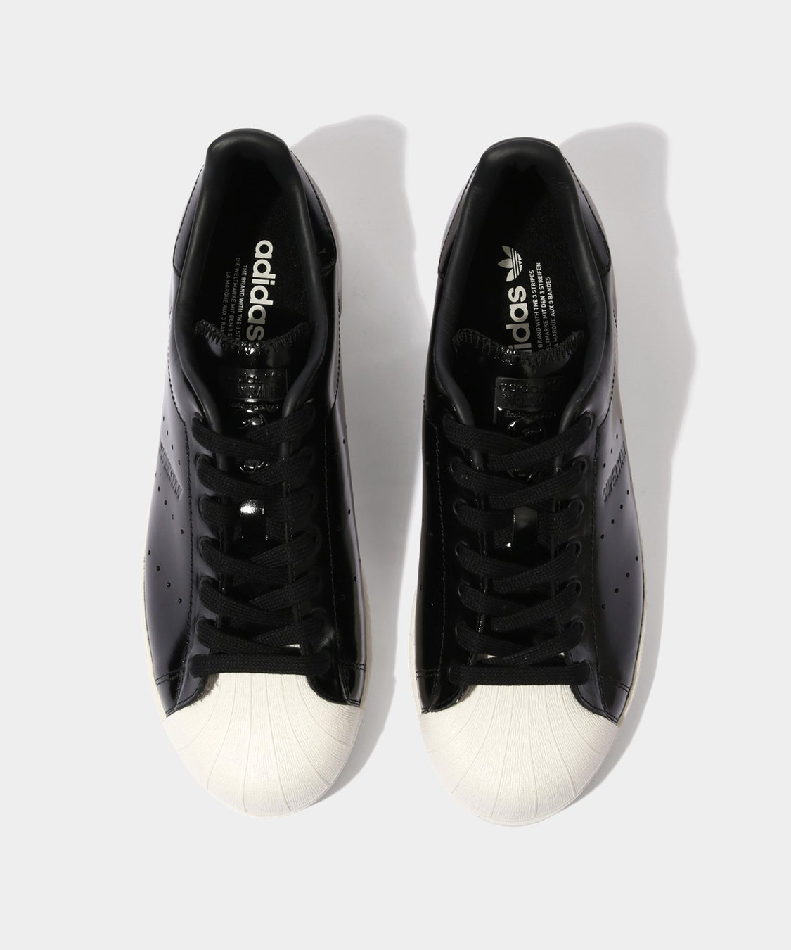 カラーは、80年代の「SUPERSTAR」を象徴するオフホワイトのソールにブラックアッパーを組み合わせた配色で表現。アッパー素材には光沢感のあるパテント素材を採用し、洗練された印象に仕上げています。