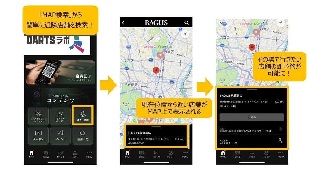 ◆ アプリ内のMAP検索で近くのお店探しが簡単に!〜web予約or電話or経路案内〜