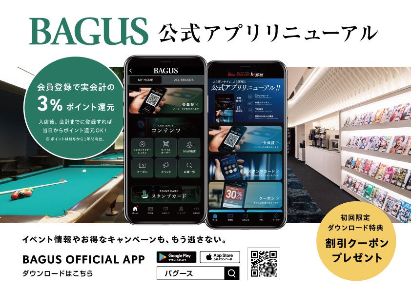 「遊ぶ・集う・寛ぐ」を網羅した『BAGUS公式アプリ』登場!ご利用毎に“実会計の3%”ポイント還元