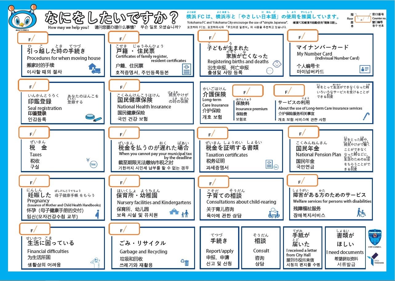 このたび、「横浜スポーツパートナーズ」の一員で、日本語学習に熱心な外国籍選手が多数在籍する横浜FCに、「やさしい日本語」による窓口案内用「指さしシート」や普及動画を作成していただきました。これらを活用し、在住外国人への広報を強化していきます。