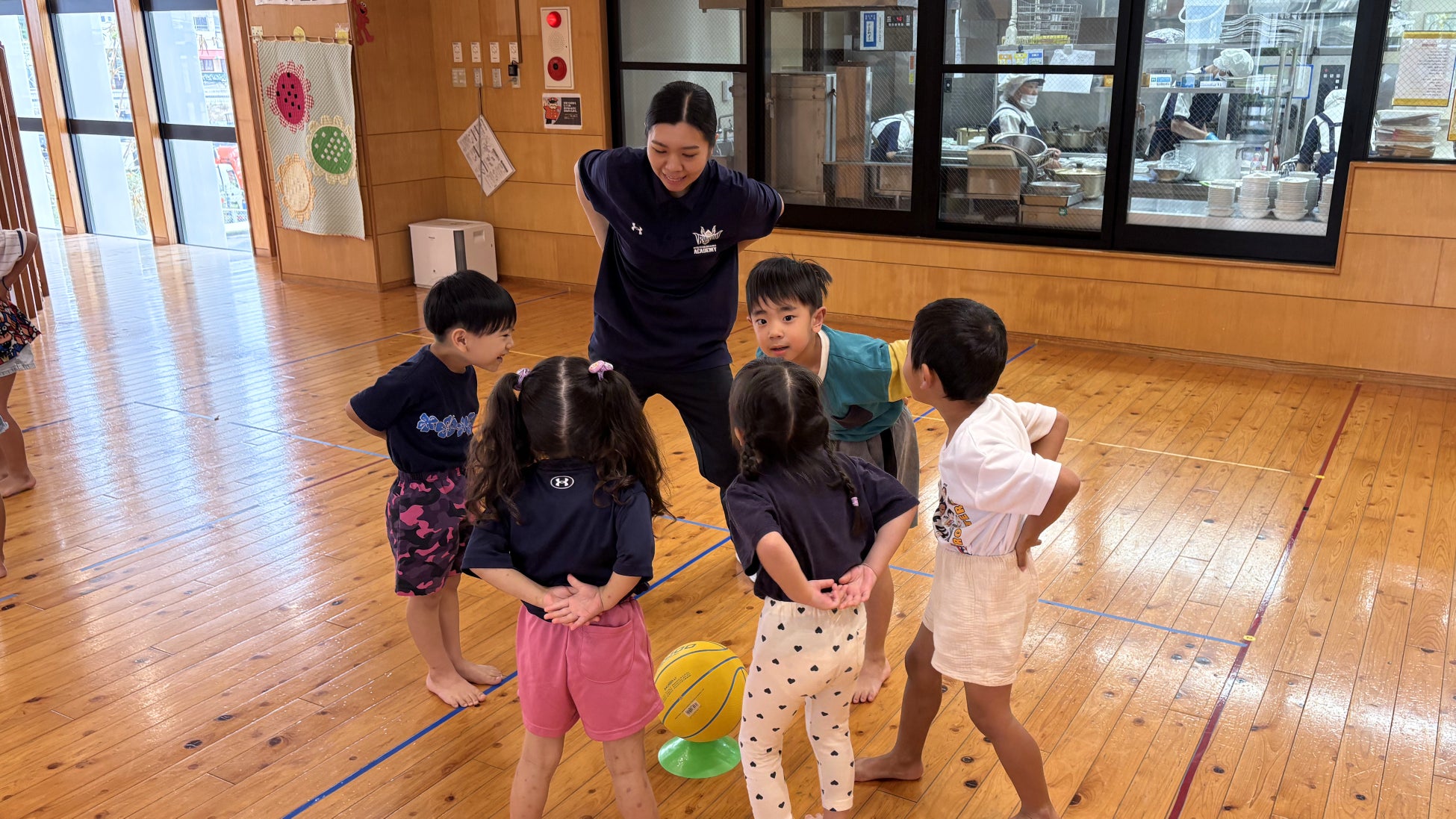 ボール遊びでは、キングスバスケットボールスクールのコーチによる指導のもと、「GO KINGS!」のかけ声でスタートし、ボールを使ったさまざまな動きを楽しみました。一生懸命にボールを追いかける子どもたちのいきいきとした姿が印象的でした。