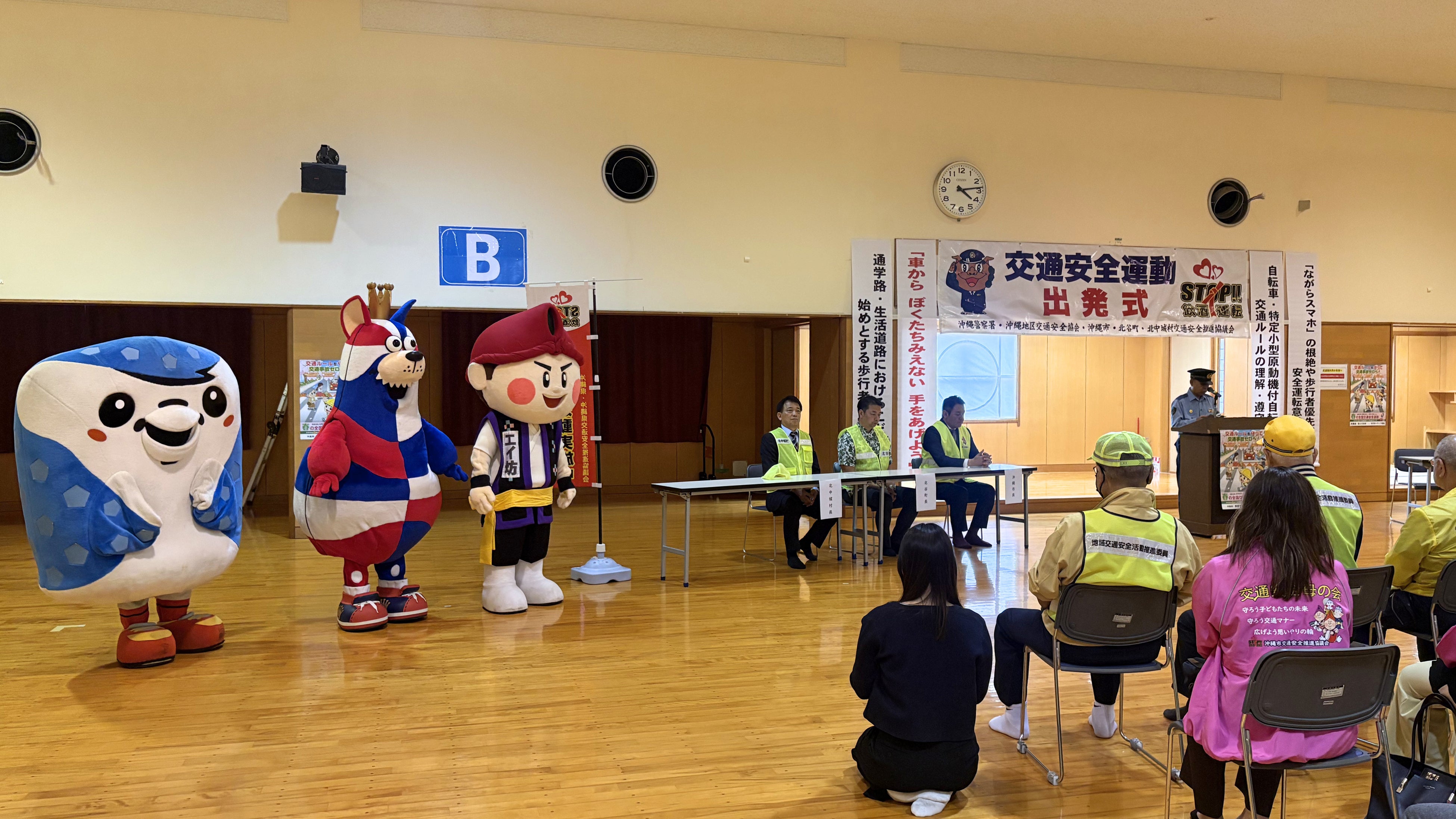 毎年この時期に行われる「春の全国交通安全出発式」では、ホームタウン沖縄市のエイサーキャラクター「エイ坊」や、FC琉球のマスコット「ジンベーニョ」とともに参加し、新年度に向けて、子どもたちや地域の皆さまに交通安全を呼びかけました。