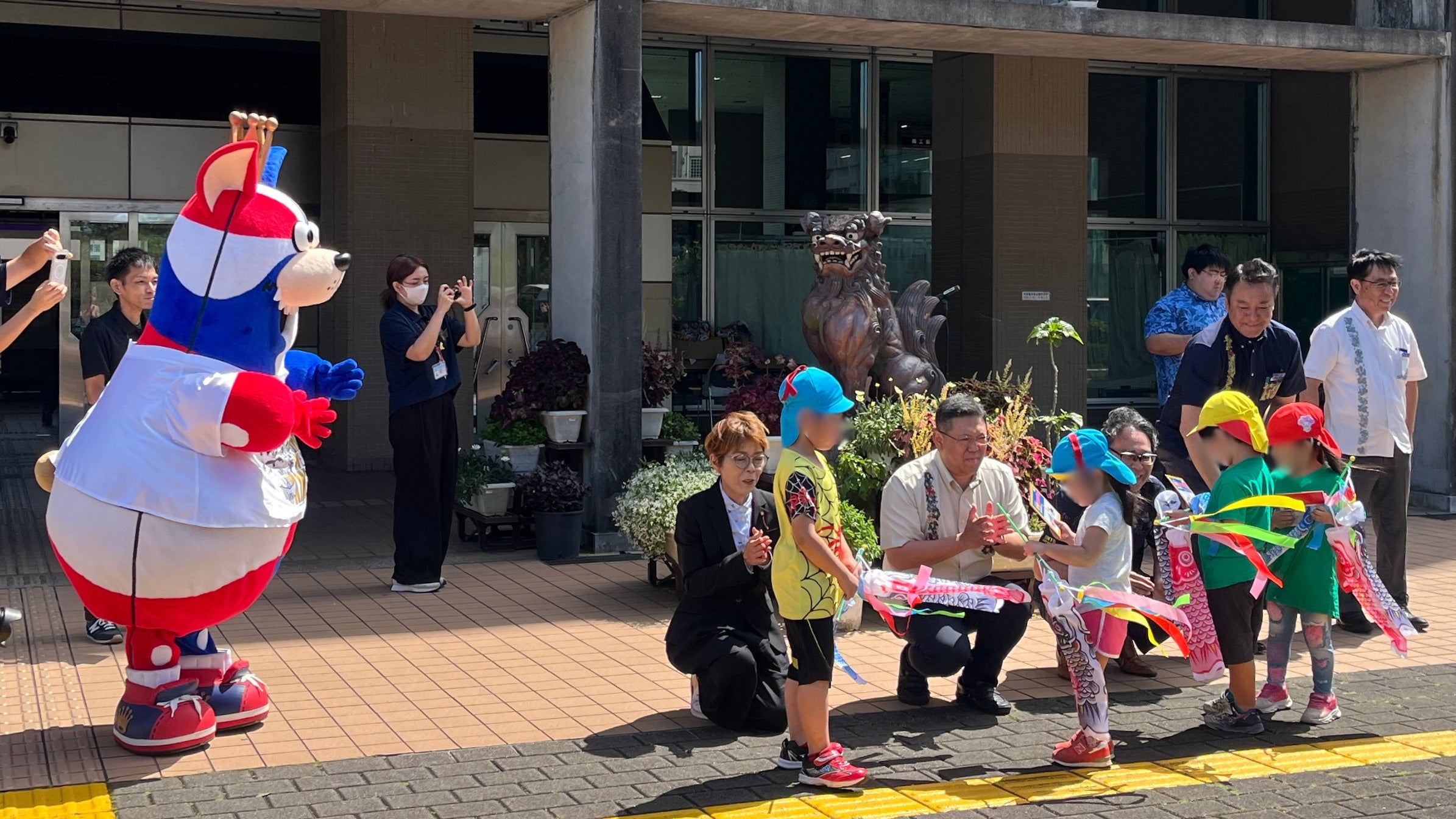 沖縄市役所で行われた「こいのぼり掲揚式」では、ゴーディーも参加し、子どもたちの健やかな成長を願い、こいのぼりの掲揚や園児によるダンス披露が行われました。式の最後には子どもたちへこいのぼりのプレゼントが手渡され、終始和やかな雰囲気に包まれました。