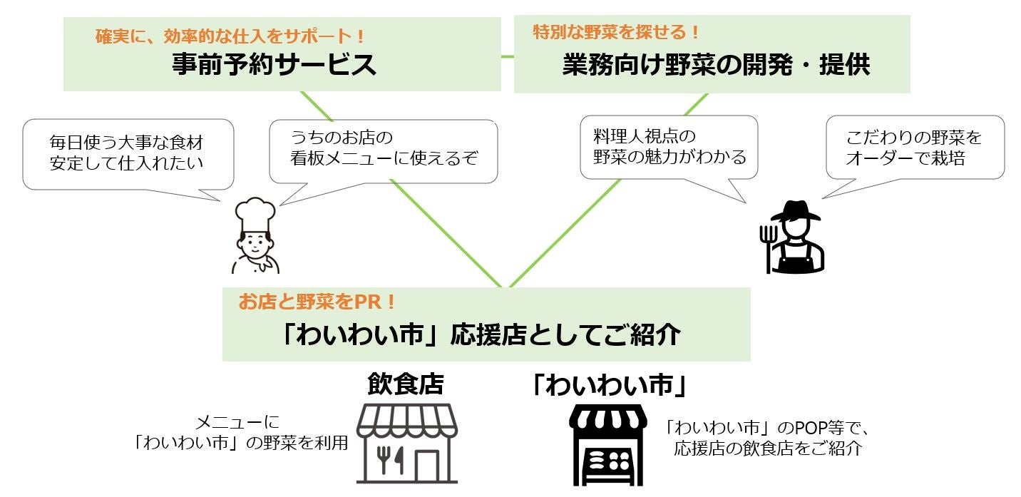 本制度は、新鮮で安全・安心な農畜産物などがならぶ直売所をご利用になるサポーター店に向けて、「地場野菜の事前予約サービス」を行い、将来的には「業務向け野菜の開発を目的とした生産者マッチング」サービス等を提供予定です。 また「直売所・飲食店による相互のPR」を行い、直売所の魅力をサポーター店から、サポーター店の魅力を直売所から、消費者に向けて発信します。