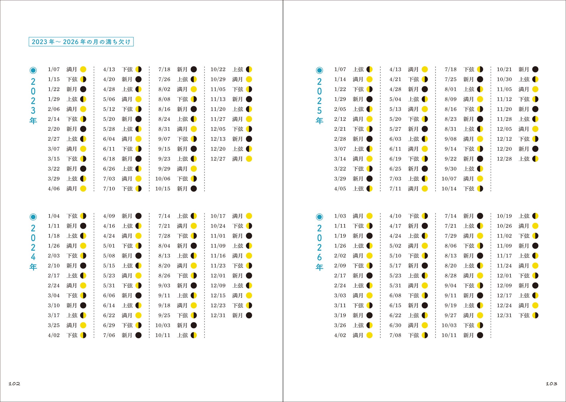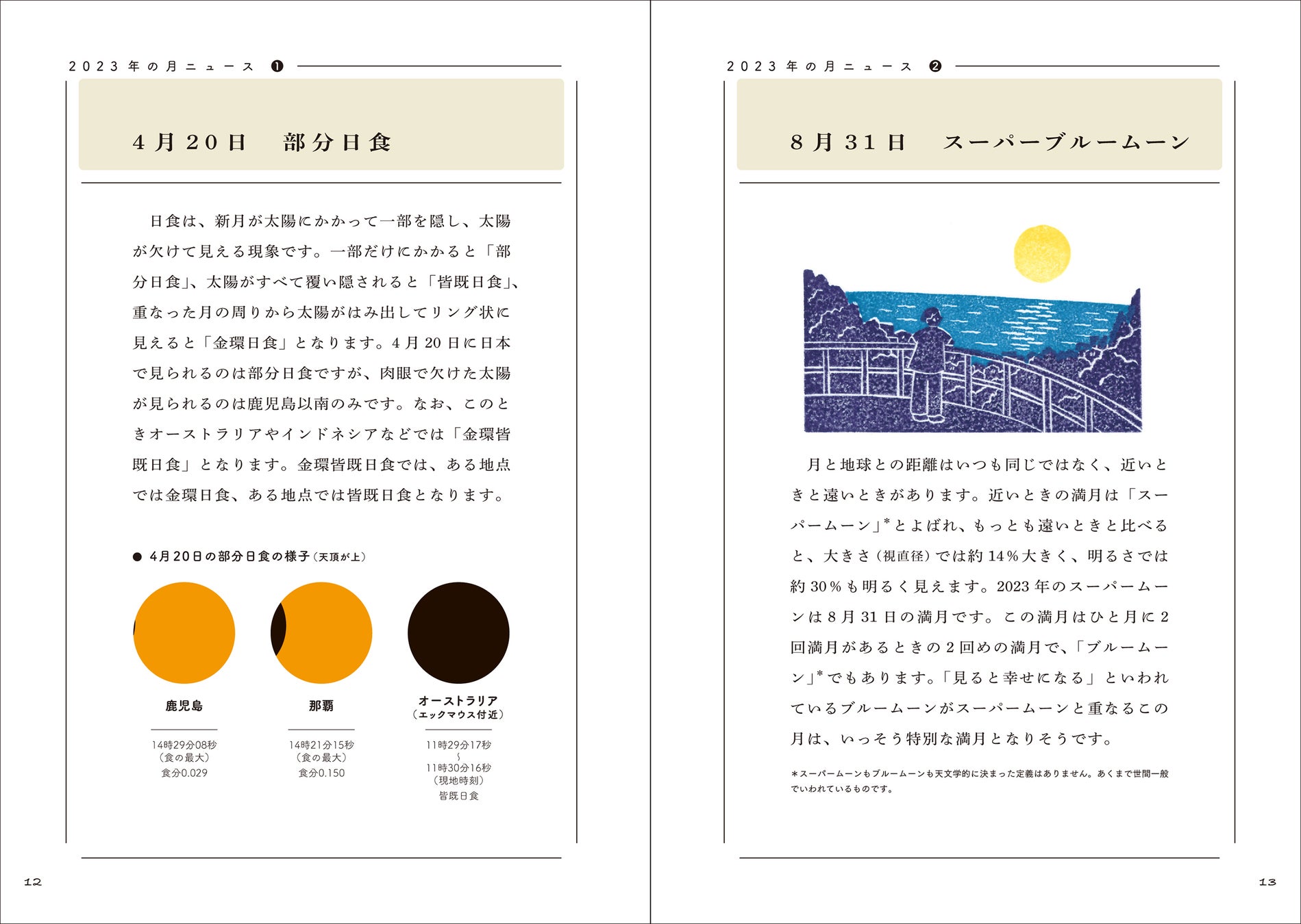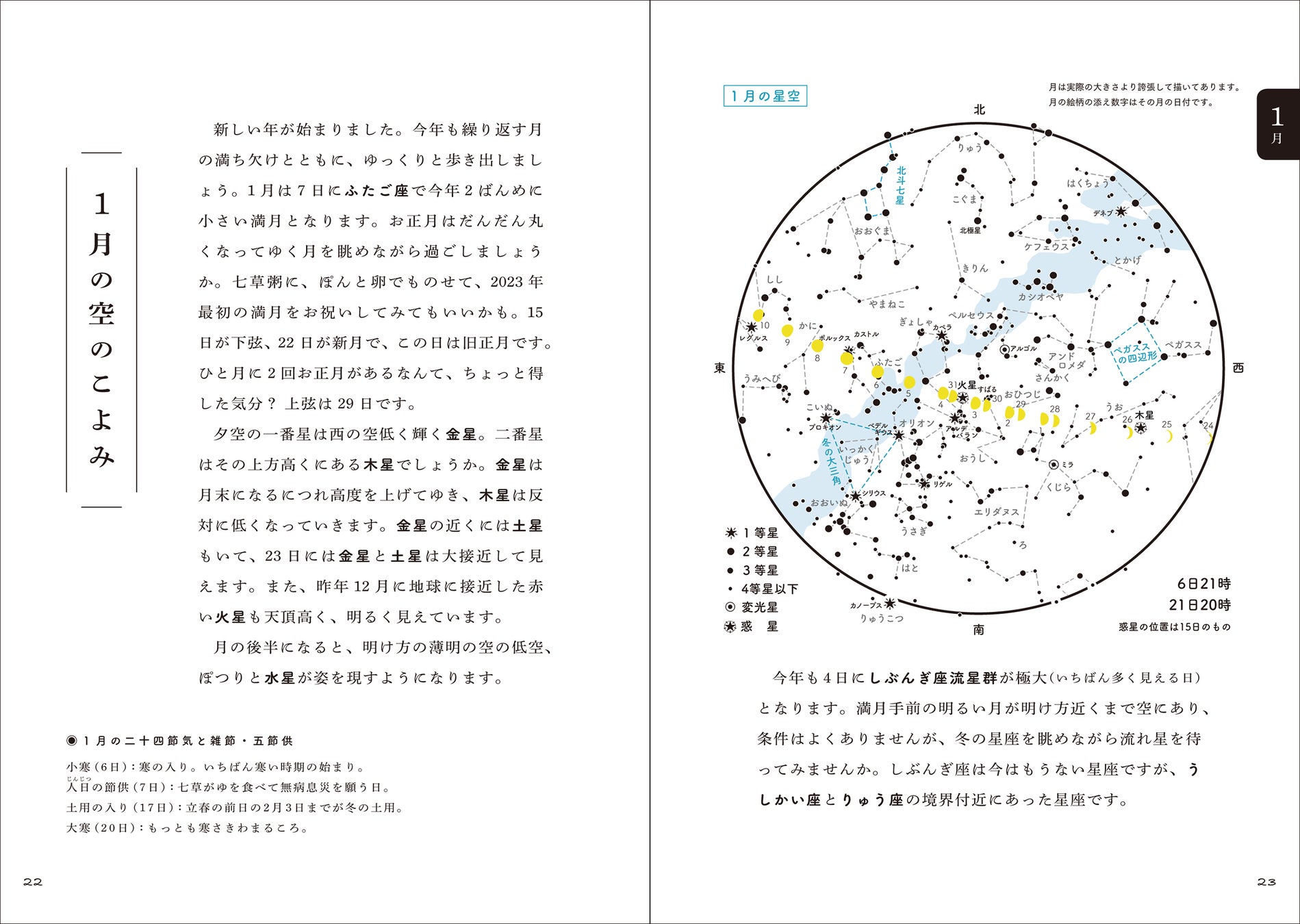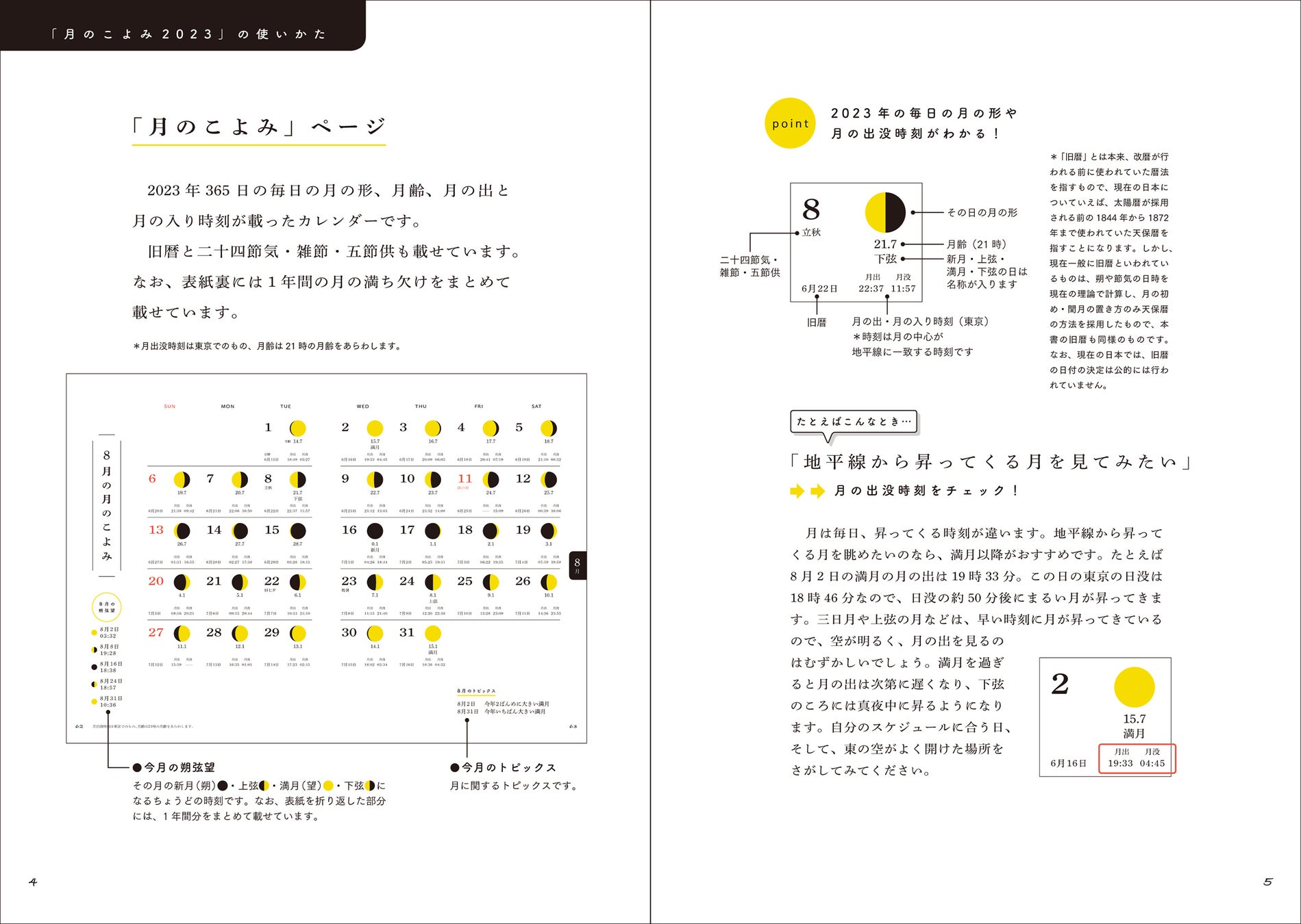『月のこよみ2023』では、満ち欠けの様子が一目でわかる2023年の「月の満ち欠けカレンダー」をはじめ、旧暦、二十四節気、毎日の月の出没時刻、毎月の星空、古来日本での月の呼び名など役に立つ情報を掲載しています。