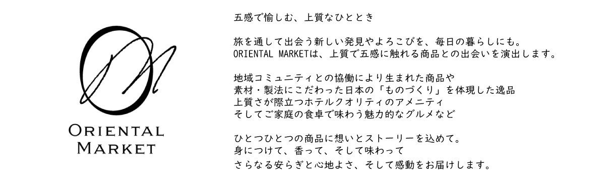 2023年6月12日(月)にリニューアルオープンしたオンラインショップ「ORIENTAL MARKET(オリエンタル マーケット)」では、これまで展開していたホテルアメニティを扱うブランド「ORIENTALIST(オリエンタリスト)」に加え、オリエンタルホテルズ&リゾーツが目指す“コ・クリエーション(地域共創)”の取り組みの一環として生まれたアパレル・雑貨ブランド「ORIENTUM(オリエンタム)」が新たに誕生しました。それぞれの特色を活かした良質なアイテムを取り揃え、より身近に地域の伝統文化や技術など様々な魅力に触れていただく機会をご提供いたします。