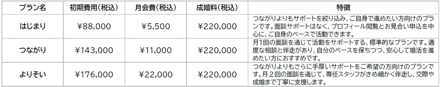 お客様の婚活スタイルやご希望に応じて、3つのプランをご用意しています。それぞれ「サポートの深さ」や「関わり方のスタイル」に違いがあり、ご希望に合わせてお選びいただけます。
