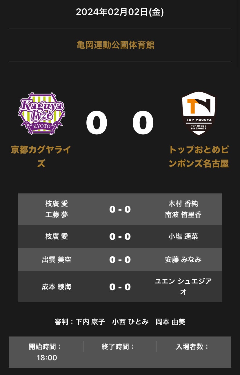 ノジマTリーグ 2023-2024シーズン 公式戦 2月2日開催 京都カグヤライズvsトップおとめピンポンズ名古屋 対戦オーダーの発表をします。