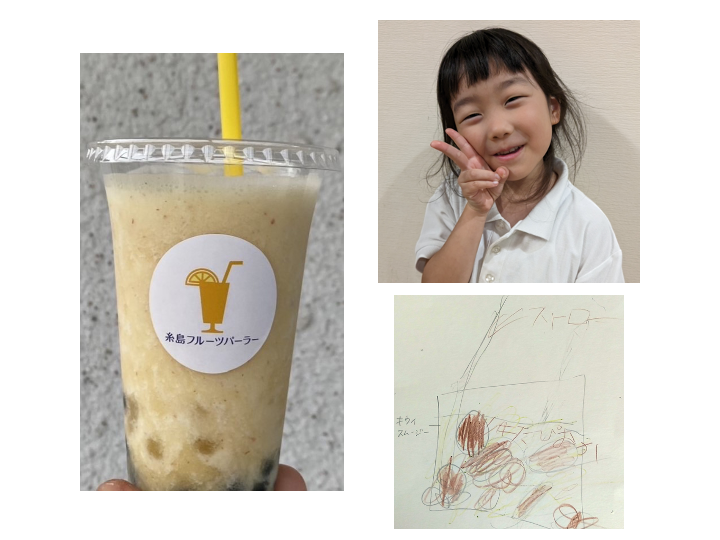 <はるかさんコメント>今回は私のかんがえたキウイスペシャルスムージーが受賞しありがとうございます。わたしのかんがえたスムージーがのめてとてもうれしいです。タピオカ入りのキウイのジュースやスムージーはみたことがないので、そんなスムージーがあったらスペシャルな感じがしたので、キウイスペシャルスムージーを思いつきました。おともだちやせんせいたちといっしょにのみたいです。タピオカとキウイの実がはいっているのでぐるぐるまわしながらたのしんでのんでほしいなとおもいます。わたしもそんなスムージーを飲めるのがとてもたのしみです。たくさんの人たちに私のかんがえたスムージーをのんでもらえるとうれしいです。