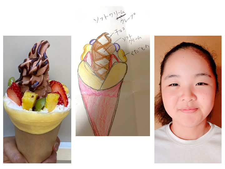 <いちかさんコメント>子どもとつくる食べものがたりに応募したきっかけは、お母さんから描いてみたら?と言われて描いたのがきっかけでした。お菓子を作るのも食べるのも好きで、クレープに果物、ソフトクリーム大好きなものが一緒に食べれたらいいなと思って描きました。ソフトクリームのクレープはあまり見た事がなかったのでソフトクリームにしました。佐賀は自然が多いので、美味しい果物がたくさんあります。果物は私が好きな果物を選んでいます。自分が考えたクレープが形になって食べられるのが楽しみです。他のメニューも楽しみにしています。