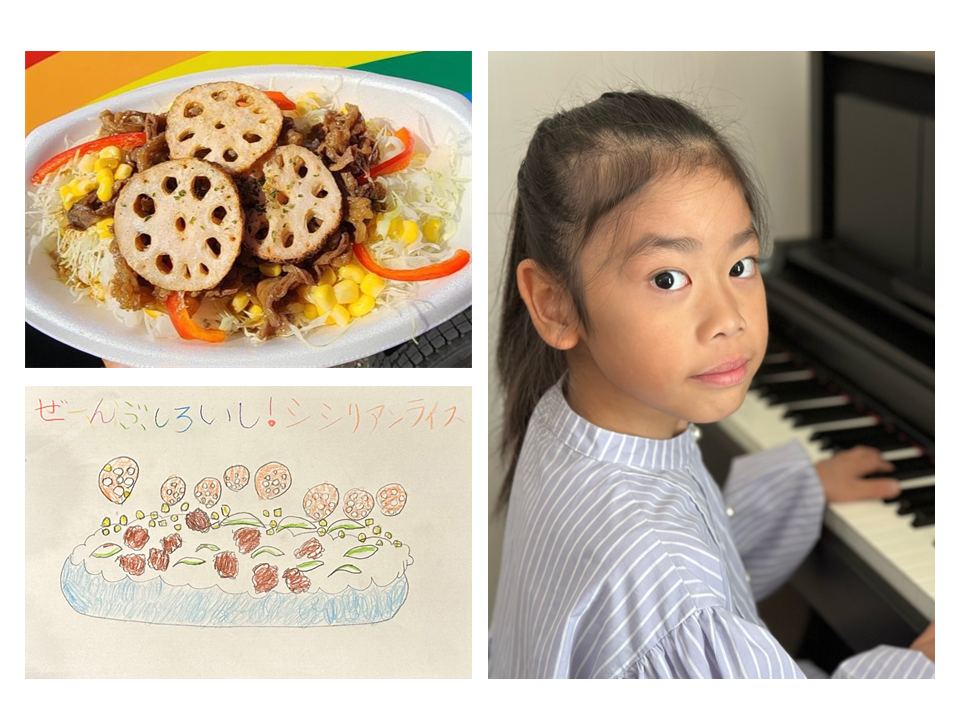 <りおさんコメント>普段から料理をするのが好きなので、メニューを考えるのはとても楽しかったです。アレルギーのあるママと一緒に食べられるシシリアンライスを作りたいと思って考えたメニューが選ばれて、本当にうれしかったです。メニューに使った白石の野菜はみんなおいしくて、わたしの大好きなものばかりです。特におすすめなのはレンコンチップスです!たくさんの人に白石の野菜を好きになってほしいと思っています。イベントでは、わたしの考えたシシリアンライスをたくさんの人に食べてもらい、笑顔になってもらいたいです!