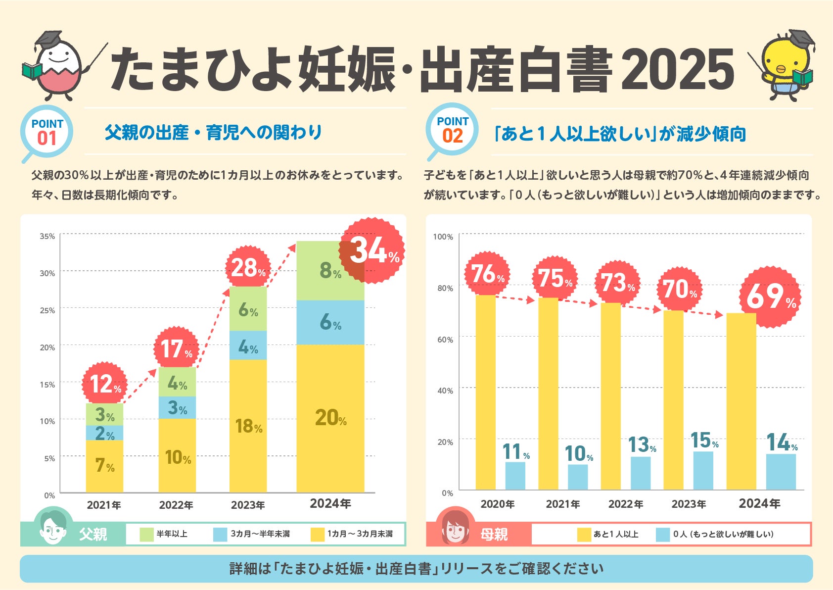 「たまひよ妊娠・出産白書2025」 母親・父親2,000人調査父親の出産・育児の休暇日数*1カ月以上は3年で2.7倍の約34%に 子どもを「あと1人以上欲しい」人は減少