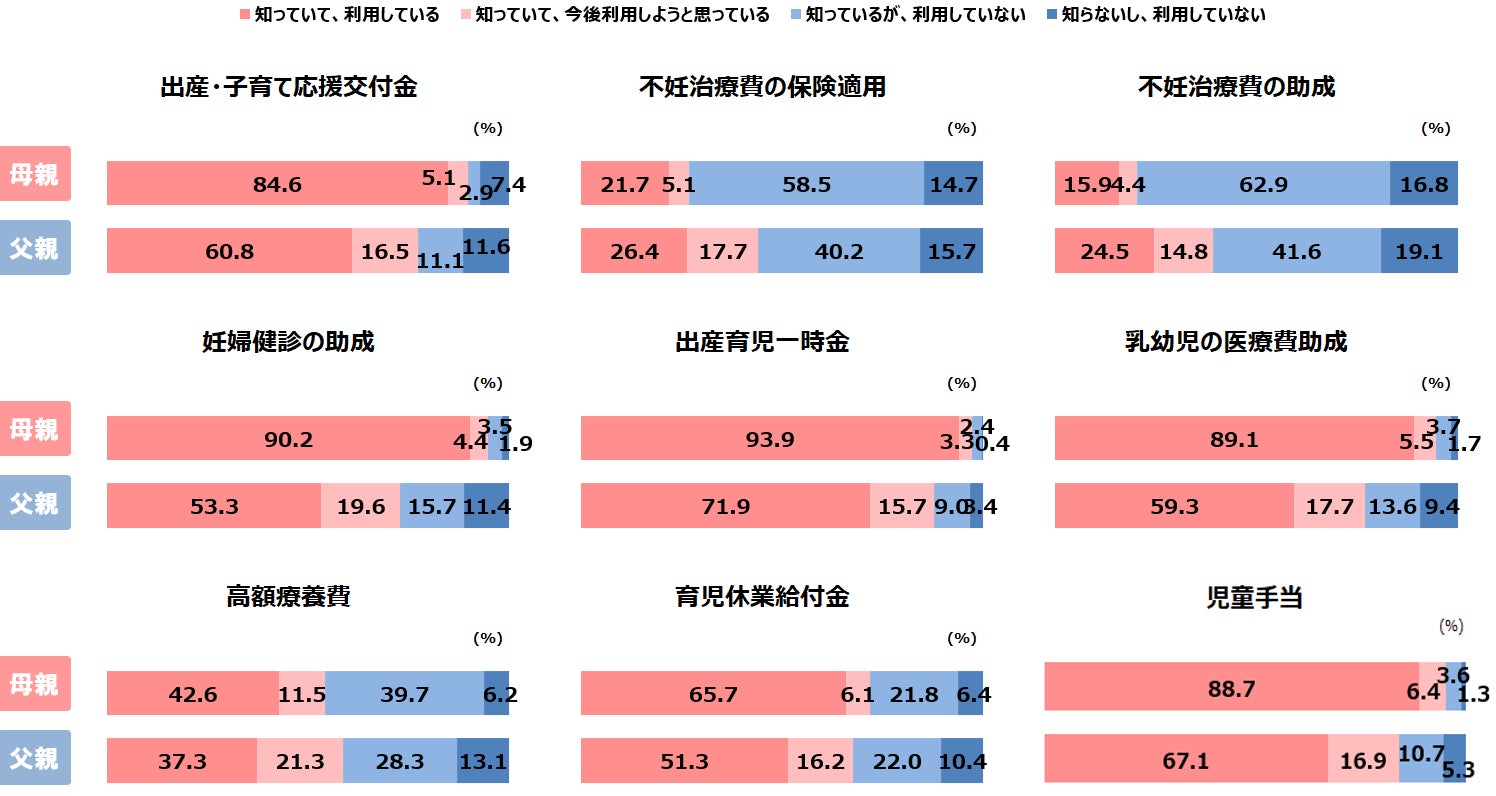 母親では、「出産・子育て応援交付金」「妊婦健診の助成」「出産育児一時金」「乳幼児の医療費助成」の認知率が高いうえ、8割以上が利用している。父親で利用率が高いのは、「出産育児一時金」「出産・子育て応援交付金」など。