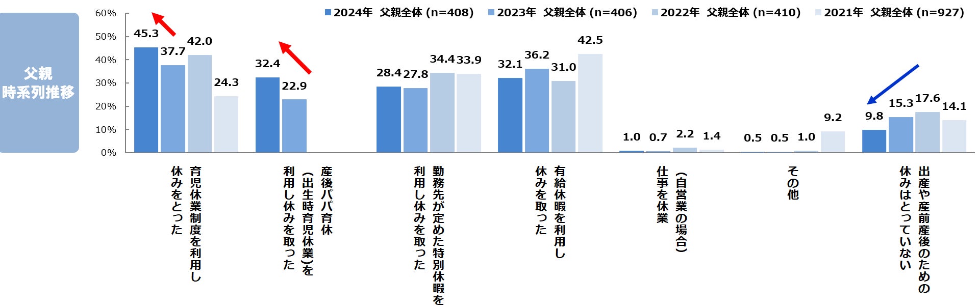 「育児休業制度を利用し休みを取った」が最も多く、昨年より増加。次いで「産後パパ育休(出生時育児休業)を利用し休みを取った」父親も昨年より9.5ポイント増え、32.4%が利用。