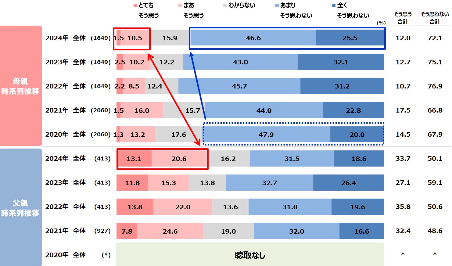 母親は、昨年と変わらず「出産・育児がしやすい社会」と思う割合は1割程度で推移。「そう思わない」の合計は昨年同様7割を超える。父親は、「そう思わない」の合計は5割。昨年から「とてもそう思う」「まあそう思う」が微増し、3割が「出産・育児がしやすい社会」だと感じている。父母間に意識の差があることがうかがえる。