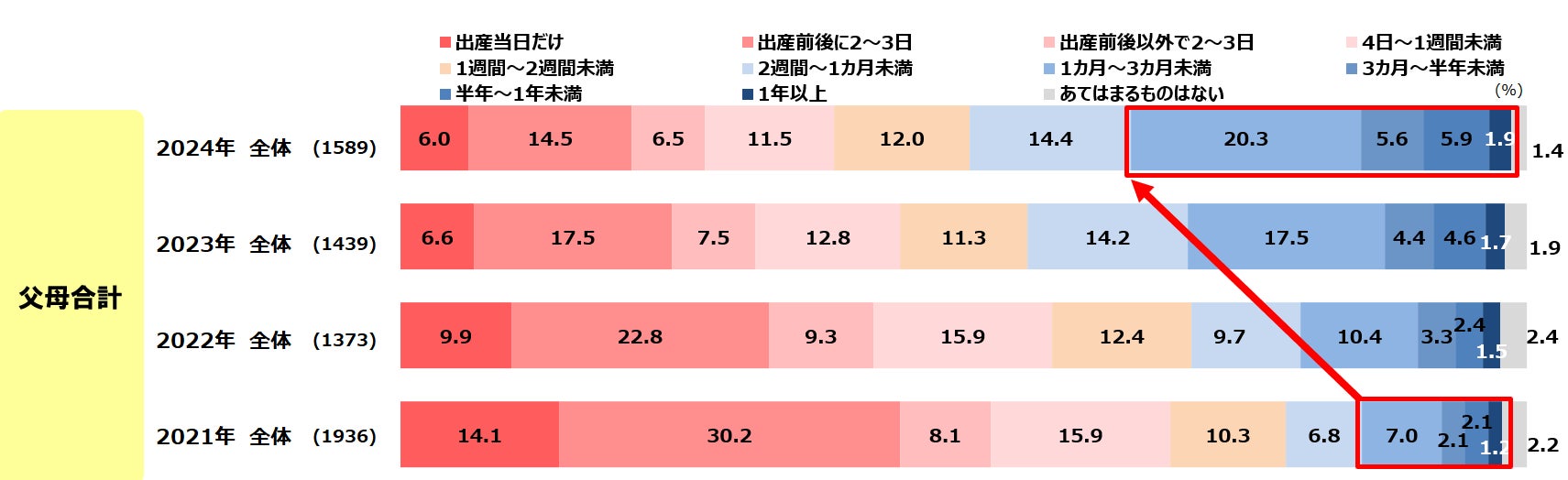 父親が出産・育児のために休暇を取得した日数は、「4日~1週間未満」より短い期間が減少し「1カ月~3カ月未満」が最も高い割合に。「2週間~1カ月未満」「1カ月~3カ月未満」「3カ月~半年未満」「半年~1年未満」「1年以上」が3年連続で増加。取得期間が1カ月以上の合計は3割を超え、より長期で出産・育児に携わっている傾向が顕著となった。