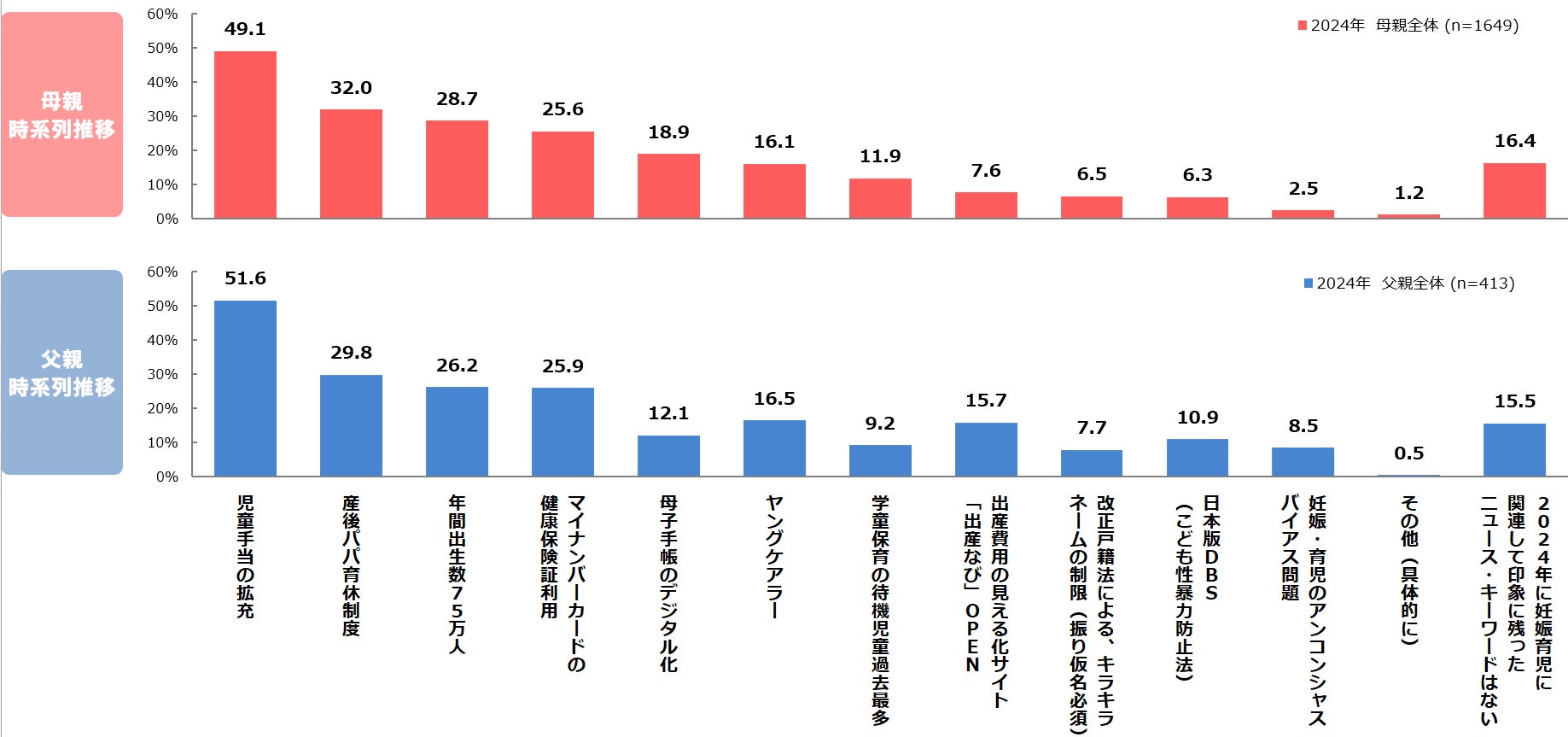 2024年印象に残ったニュース:父母ともに「児童手当の拡充」の印象は強い様子。次いで「産後パパ育休制度」「年間出生数75万人割れ」が続く。