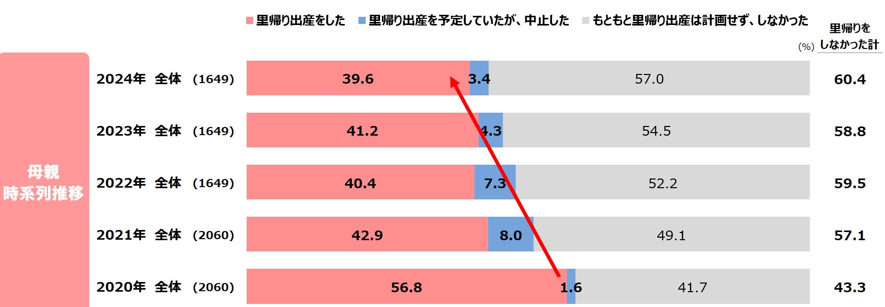 里帰り出産をした人は4割をきり、減少傾向。「もともと里帰り出産は計画せず、しなかった」も増加傾向。コロナ禍以降、里帰り出産をしない傾向が続いていると思われる。