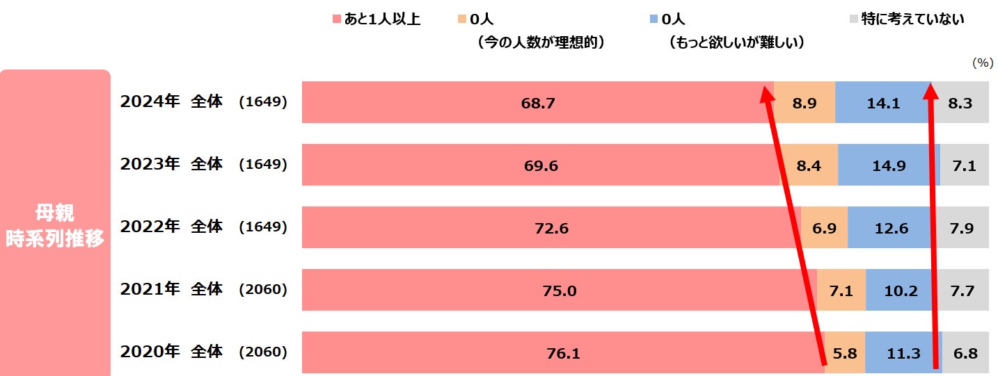 家族計画:「子どもをあと1人以上欲しい」母親は4年連続減少。「もっと欲しいが難しい」の増加傾向も続く。