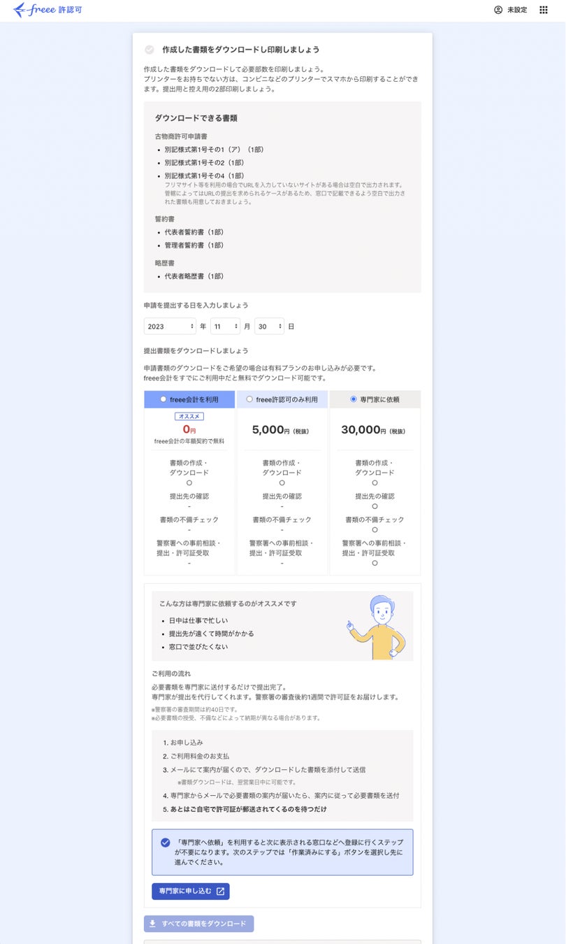 ・freee許認可で作成した古物商営業許可申請の書類と証明書類を郵送すると専門家が申請まで実行します