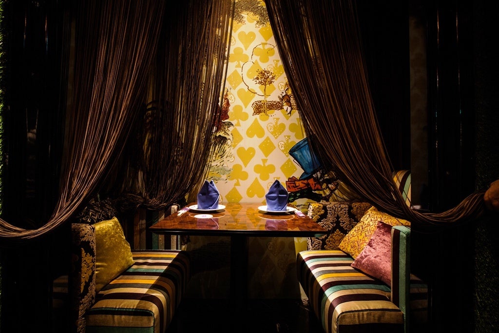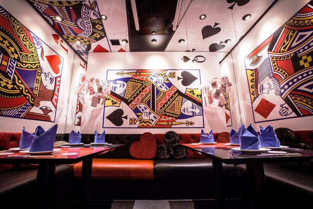 このメインフロアを中心として、大きな大きなトランプに囲まれるソファー席やハートの女王様ご自慢の庭を模したテーブル席などを設えた英国文学「不思議の国のアリス」の世界観を存分にお楽しみいただける❝リアルでファンタジーの世界に迷いこめる❞レストランです。