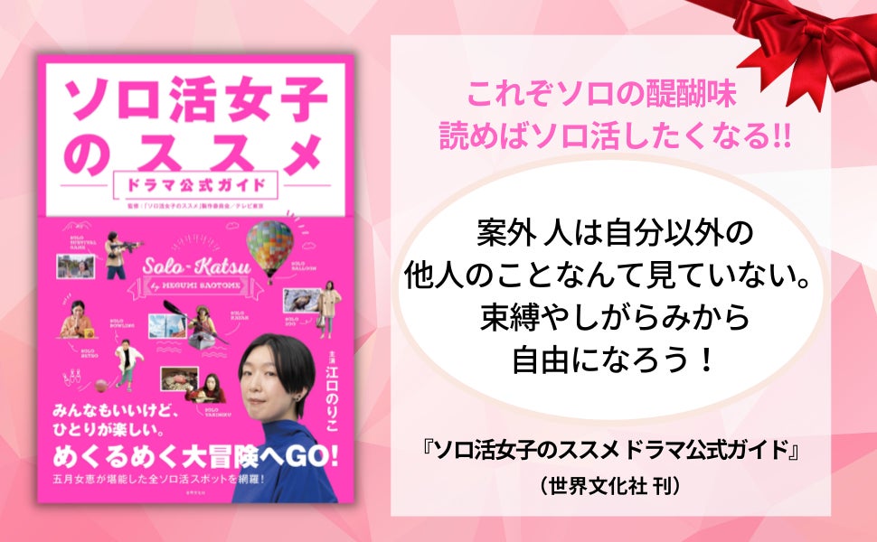 女優・江口のりこさん演じる主人公・五月女恵が、ヘリ、寿司、中国料理、遊園地、温泉、せんべろ、リムジン、ラブホテルなど、複数で楽しむのが常識とされてきたスポットにソロで乗り込み、自由で贅沢な時間を堪能する姿が反響を呼んだドラマ『ソロ活女子のススメ』が本になりました! コロナ禍で自分を見つめる機会が増え、ますます「ソロ活」の魅力に気づく人が増えています。ソロで計画し、行動するからこそ、自分だけの人生を生きる醍醐味が手に入る。ドラマに登場した全ロケ地を網羅した巡礼ガイド。読めばソロ活したくなること間違いなしの1冊です。https://www.sekaibunka.com/book/exec/cs/22221.html- 主人公・五月女恵が挑戦した「ソロ活」の全ロケ地を網羅!