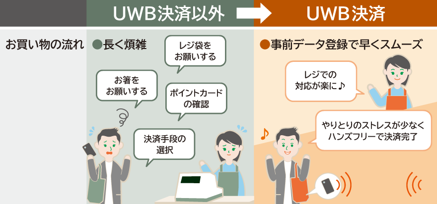 UWB通信とは、Wi-Fi等と同程度の距離で通信が可能な次世代の無線通信技術です。店舗の決済端末にかざすNFC※3やスマートフォン等で画面の読み取りが必要な二次元コード決済とは異なり、数十メートルの距離があってもデバイスの正確な位置の特定や高速通信が可能であることから、決済や要望の伝達におけるユーザーおよび店舗の課題を解決する新たな店舗内体験の実現手段として注目されています。