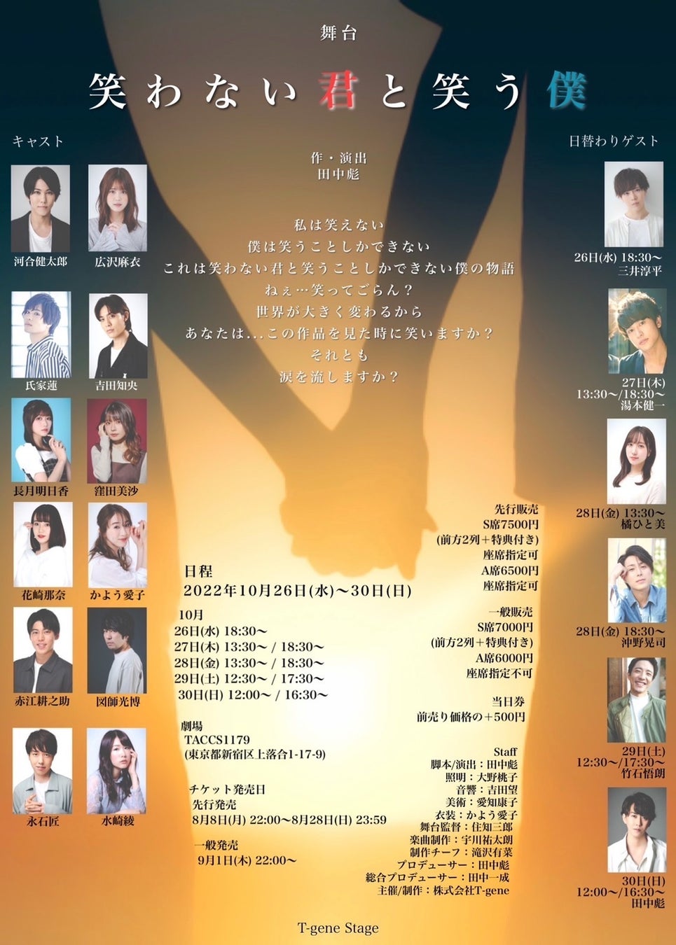 株式会社T-gene(東京都中央区、代表:田中一成)主催、舞台『笑わない君と笑う僕』が2022年10月26日(水) ~ 2022年10月30日(日)にTACCS1179(東京都新宿区上落合1丁目17-9 HAIKYO)にて上演されます。