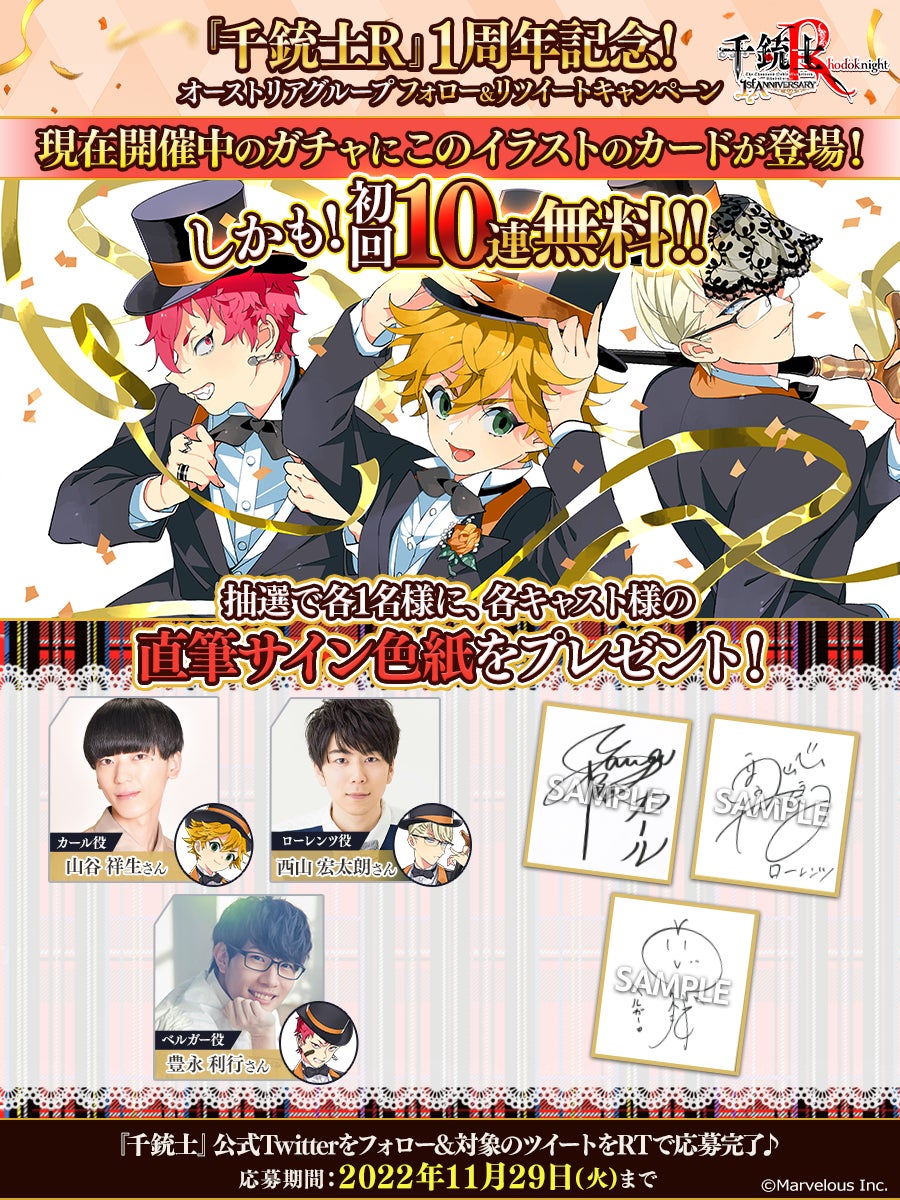 株式会社マーベラス(代表取締役社長:佐藤 澄宣/所在地:東京都品川区)による、スマートフォンゲーム『千銃士:Rhodoknight』(読み:せんじゅうし ろーどないと 以降、『千銃士R』)は、11月16日より開催中の1周年記念イベント「Brave Musketeers Day:Night」にあわせて、イベント内で活躍するフランス、オーストリアグループの★3の新カードがピックアップで登場する期間限定ガチャを開催いたします。