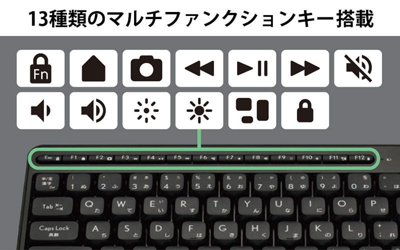 メディアプレーヤーの起動、音量や明るさの調整などが専用キーを押すだけで実行できる、13種類のマルチファンクションキーを搭載しています。