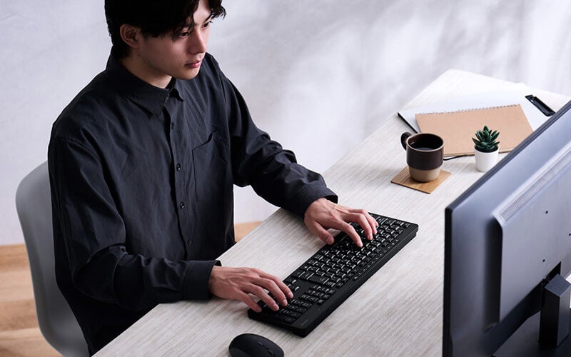 無線2.4GHz接続モデルと有線接続モデル、テンキー付きのフルサイズキーボードとテンキーレスのミニサイズキーボードをラインアップし、用途に合わせて選べます。無線2.4GHz接続モデルは黒モデルと白モデルを用意しており、使用される環境のインテリアに合わせて選ぶことができます。