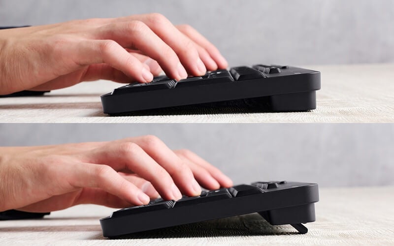姿勢に合わせて傾斜角を2段階で調整できる角度調整スタンドを搭載し、スタンドの底面にはキータッチを安定させる滑り止めも備えています。
