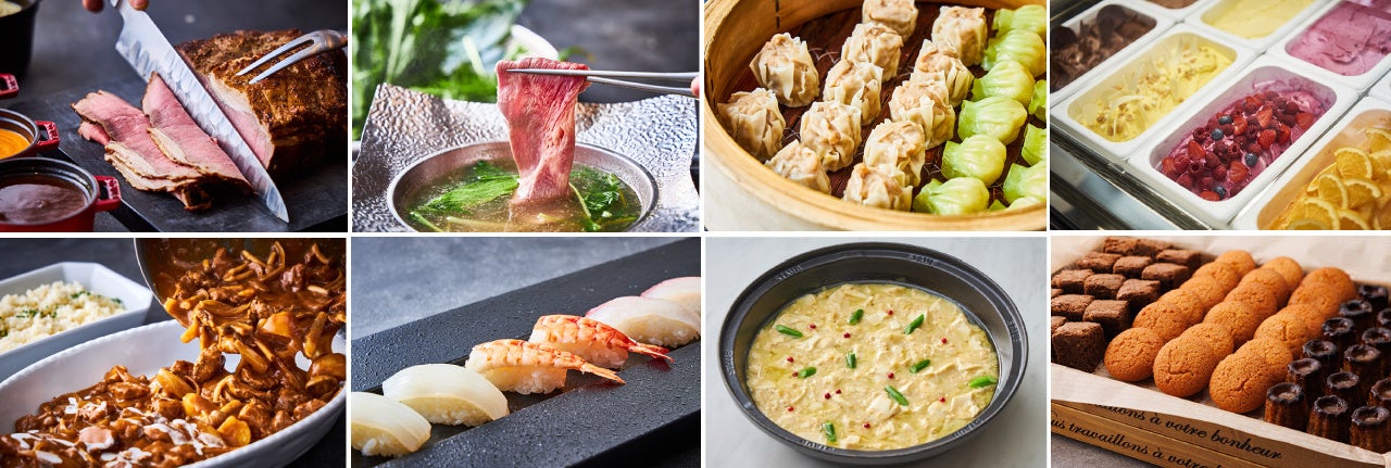 西洋料理では、肉の旨味が口の中に広がる「ジューシーローストビーフ低温調理 64℃仕上げ」や、クロスダインおすすめの「ビーフシチュー」や「ビーフストロガノフ」にバターライスを合わせてお楽しみください。日本料理では、旬の貝を使用した特製“海鮮貝だし汁”で味わう「野菜と仔羊のしゃぶしゃぶ」やディナータイムには握り寿司など、シェフがその場で調理パフォーマンスを繰り広げます。中国料理では、香辛料特有の辛味の中にあるコクと旨みを追求した多彩な味覚をお届けします。クロスダインおすすめの「白麻婆豆腐」をはじめとした煮込み料理や深い味わいの炒め物、麺類などが楽しめ、目の前で蒸しあげる点心もおすすめの一品です。パティシエが作る焼き菓子や季節のジェラート、ホテルメトロポリタン伝統のコクと深みのあるバニラアイスクリームもご賞味ください。