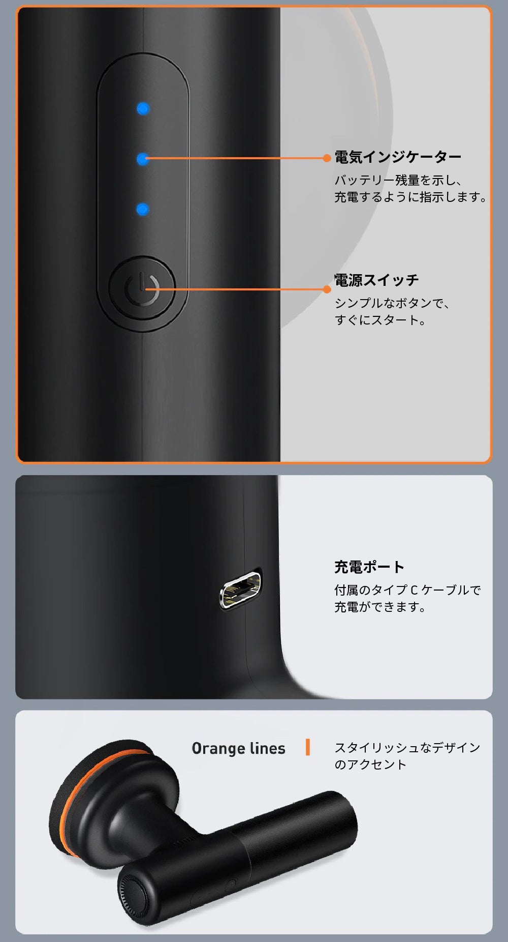・Type Cケーブル付属、フル充電で45分連続稼働可能