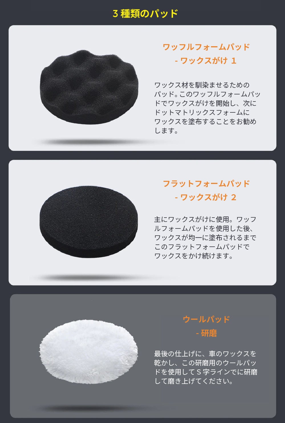 - ワックスがけの行程に合わせた、3つのパッドが付属