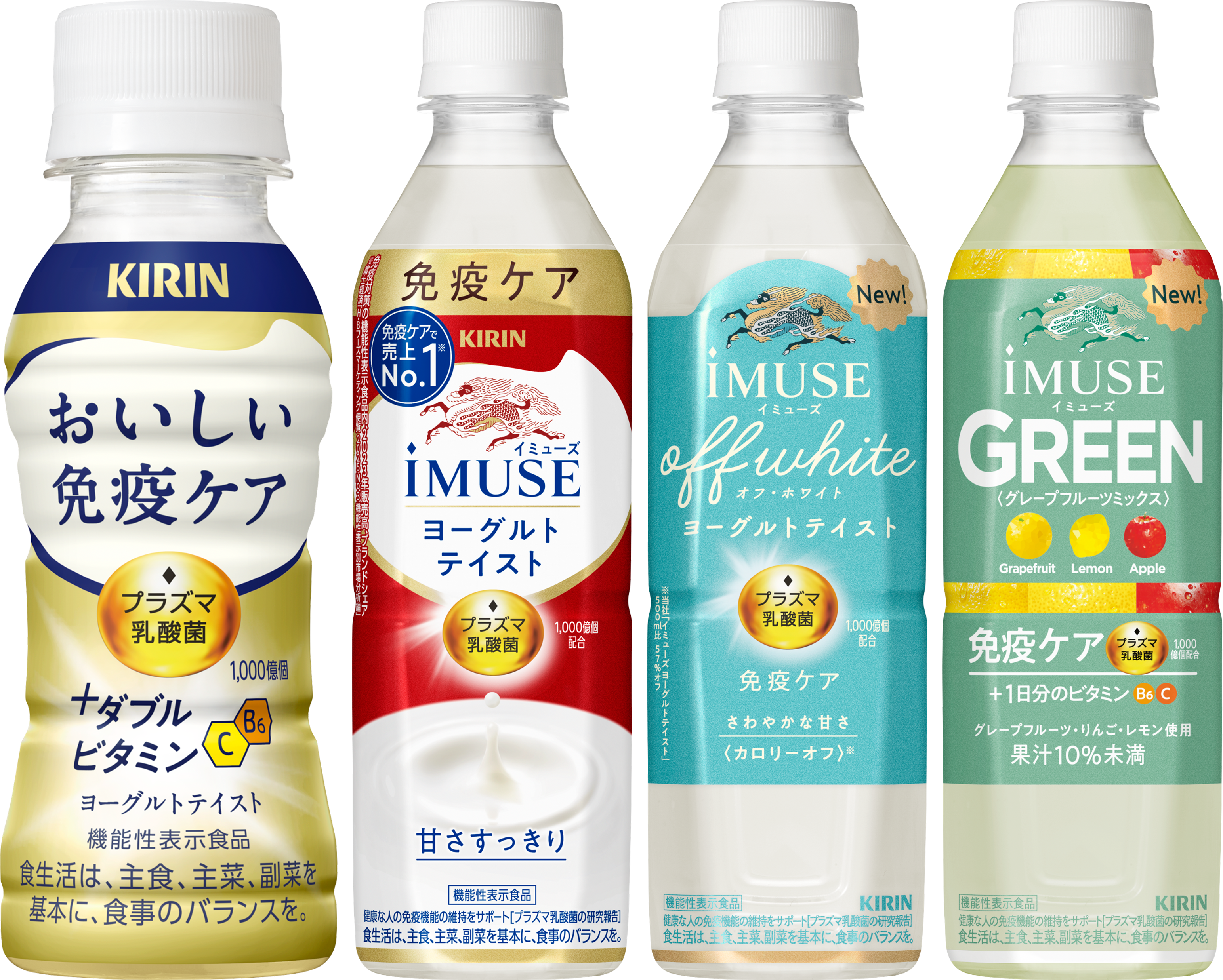 また、日本で初めて免疫機能の機能性表示食品として届出公表された「iMUSE」シリーズは、発売以降、毎年販売数量が伸長しています。今回、「キリン iMUSE ヨーグルトテイスト」はヨーグルトテイストらしいおいしさと機能感を強化したパッケージにリニューアルし、「キリン iMUSE オフ・ホワイト ヨーグルトテイスト」「キリン iMUSE グリーン」はパッケージデザインに加え、中味もリニューアルし、「日常的にゴクゴク飲める、すっきりとした味わい」に進化しました。